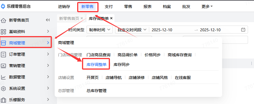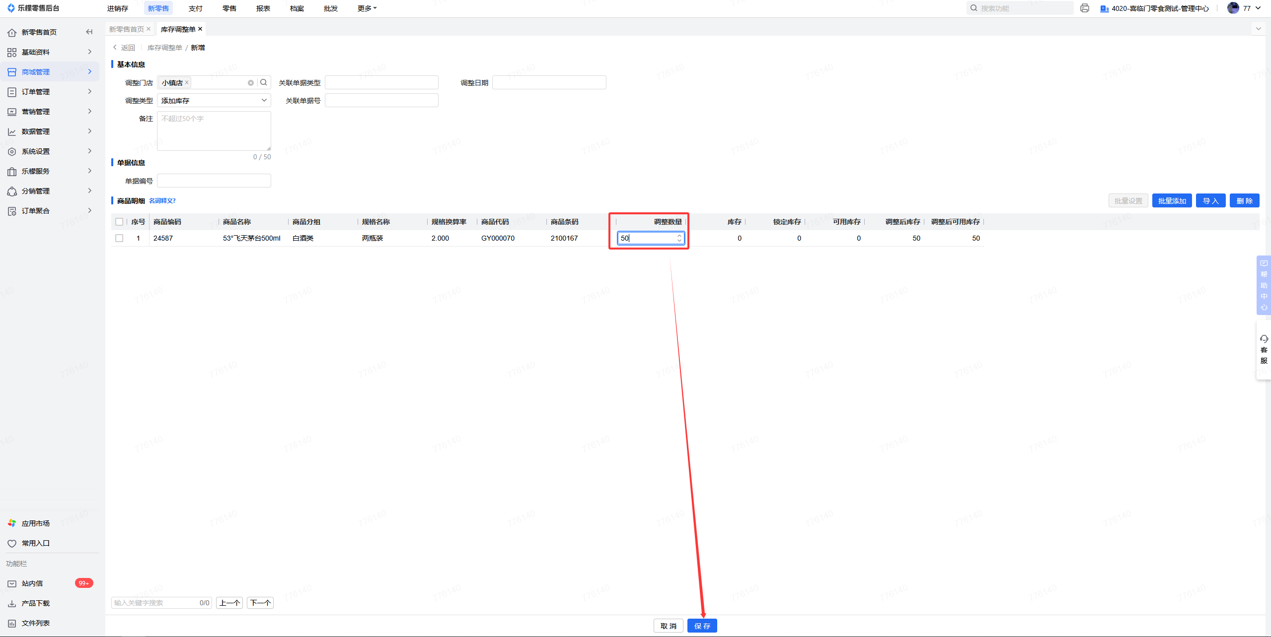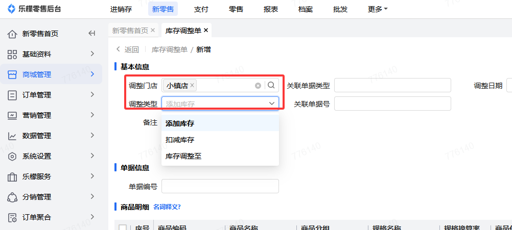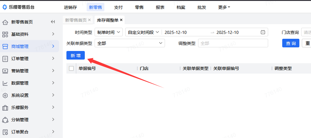 👉【操作路径】:乐檬新零售V2-商品管理-点击库存调整单-点击【新增】按钮