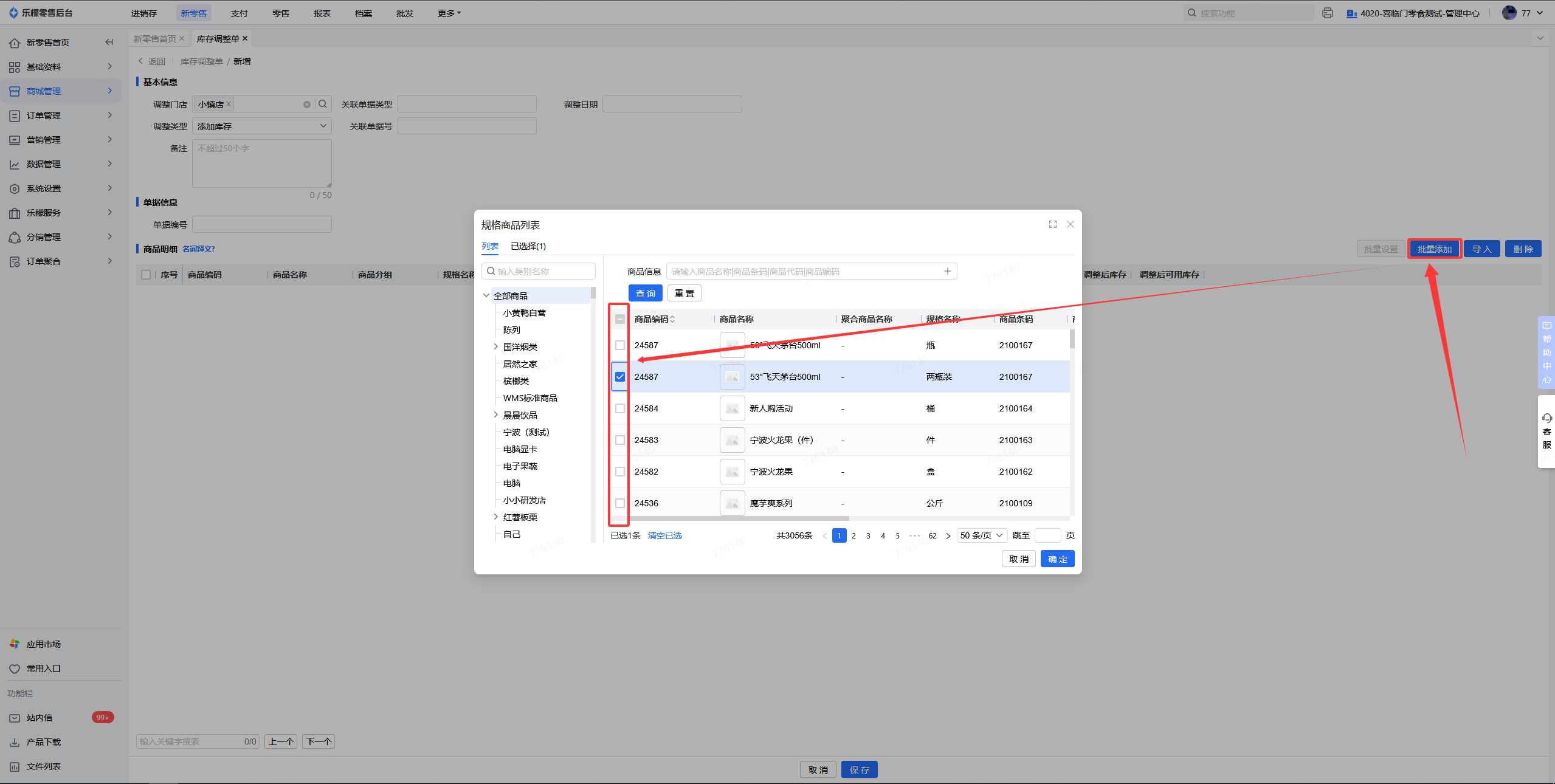 2、点击批量添加,选择需要添加的商品,录入需要调整的数量,最后点击保存生效