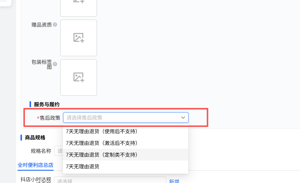 新增、编辑商品时会根据商品类目实时查询该商品是否需要售后政策以及是否必填,商家可根据页面提示及选项进行设置。不同类目的售后政策可能会不同。商家根据实际服务要求进行填写。