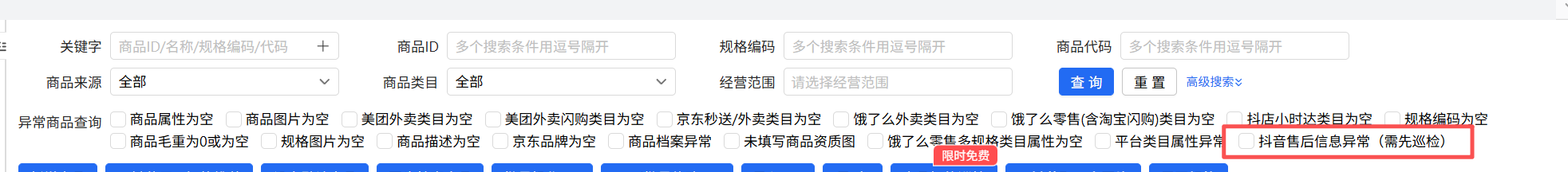 异常商品查询支持将抖音售后信息异常的商品查询出来,使用时先进行商品巡检。