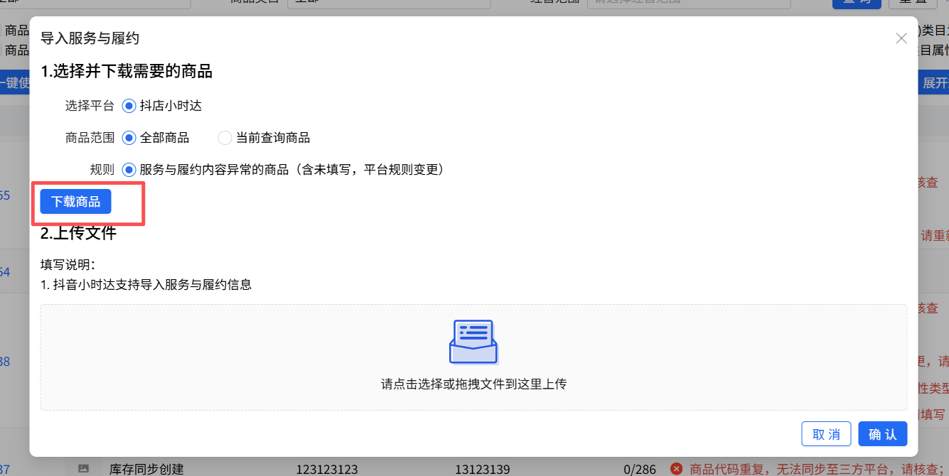 本次系统升级迭代,为提高商家作业效率,同一平台统一管理商品信息,对接抖音小时达服务与履约设置项,强烈建议经营抖音小时达的客户对商品进行检测,并维护好商品资料,避免同步失败,主要功能包括:1、新增商品、编辑商品支持维护服务与履约信息;2、支持查询服务与履约信息未填写的商品;3、意见导出渠道异常商品支导出持服务与履约信息未填写的商品4、商品巡检增加策略相应策略5、商品同步时支持将服务与履约信息同步至抖音小时达;6、支持将抖音小时达服务与履约信息同步至商品库;7、支持批量导入商品服务与履约信息