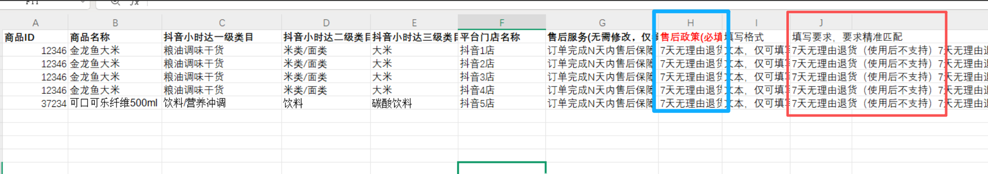 在红色填写要求中,选一个符合商品售后政策的信息,填写到蓝色区域内,要求精准匹配。导入后,系统会自动回填到商品库中。