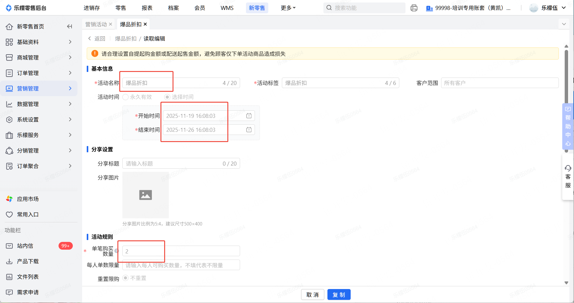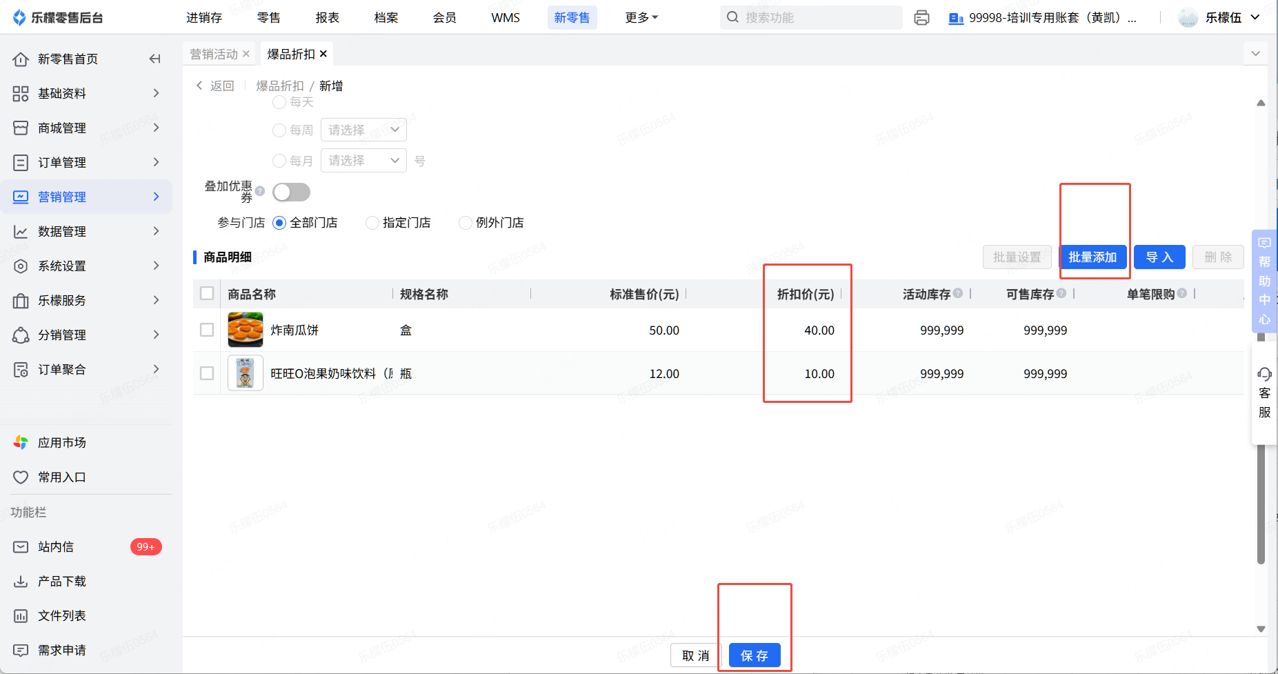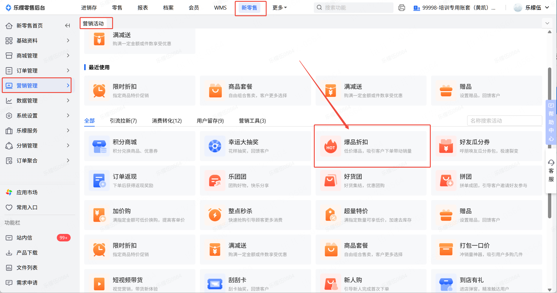 👉【操作路径】:1.点击新零售 - 2.营销管理,营销活动 - 3.点击爆品折扣 - 4.点击新增