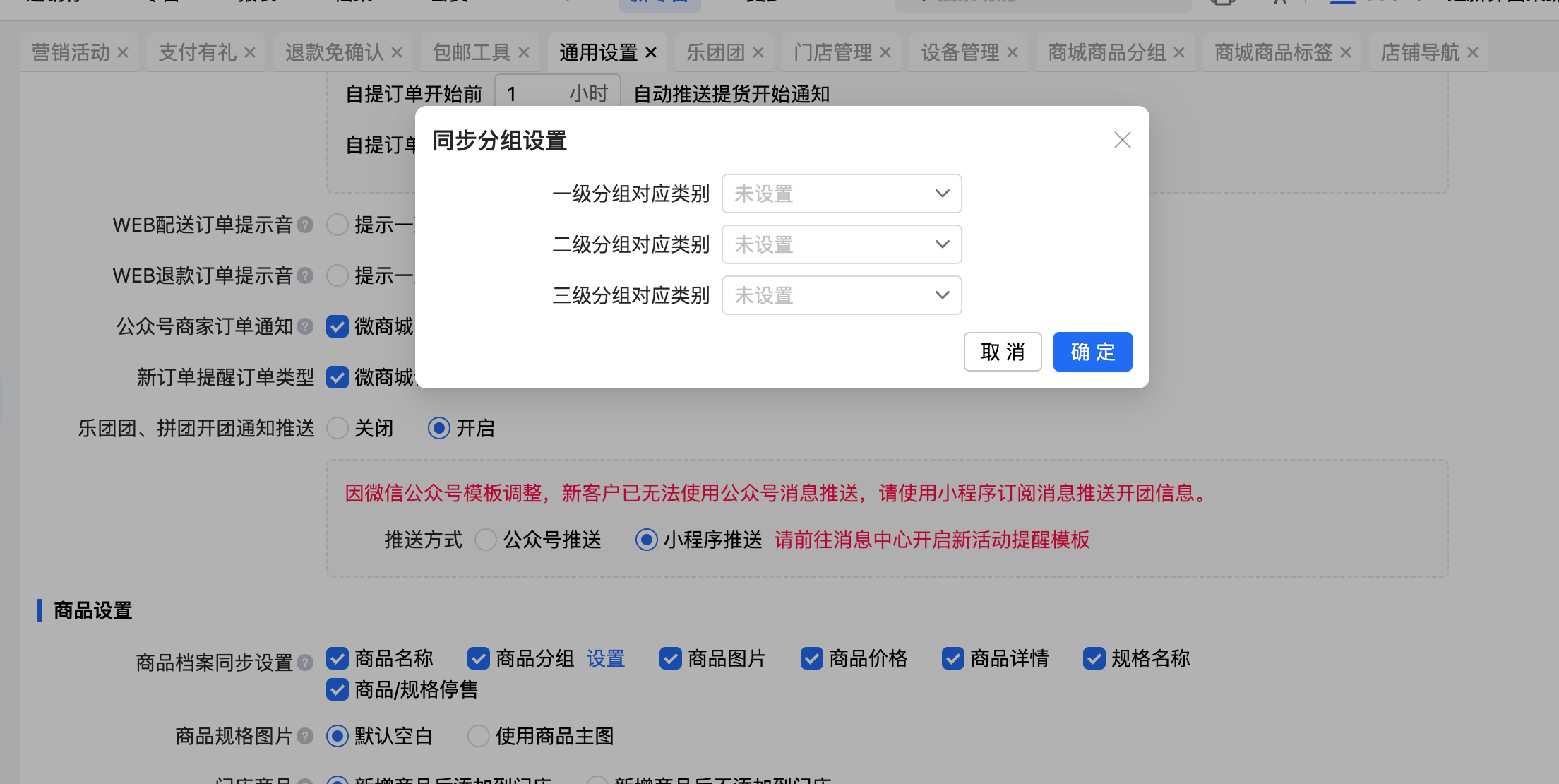 商品档案同步设置-商品分组,支持设置三级分组需要同步的分类,未设置时不同步三级分组