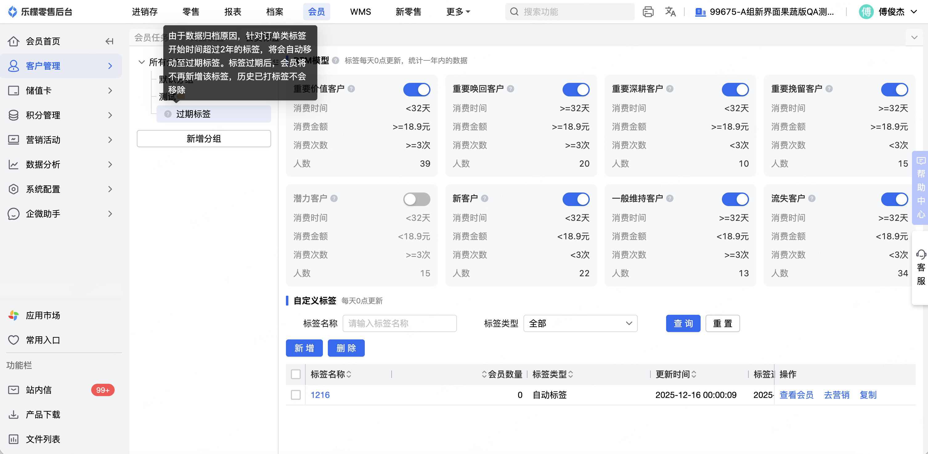 1、全渠道会员新增过期标签分组,针对过期的标签将会自动移至该分组下,同时过期的标签将不会继续统计会员数量
