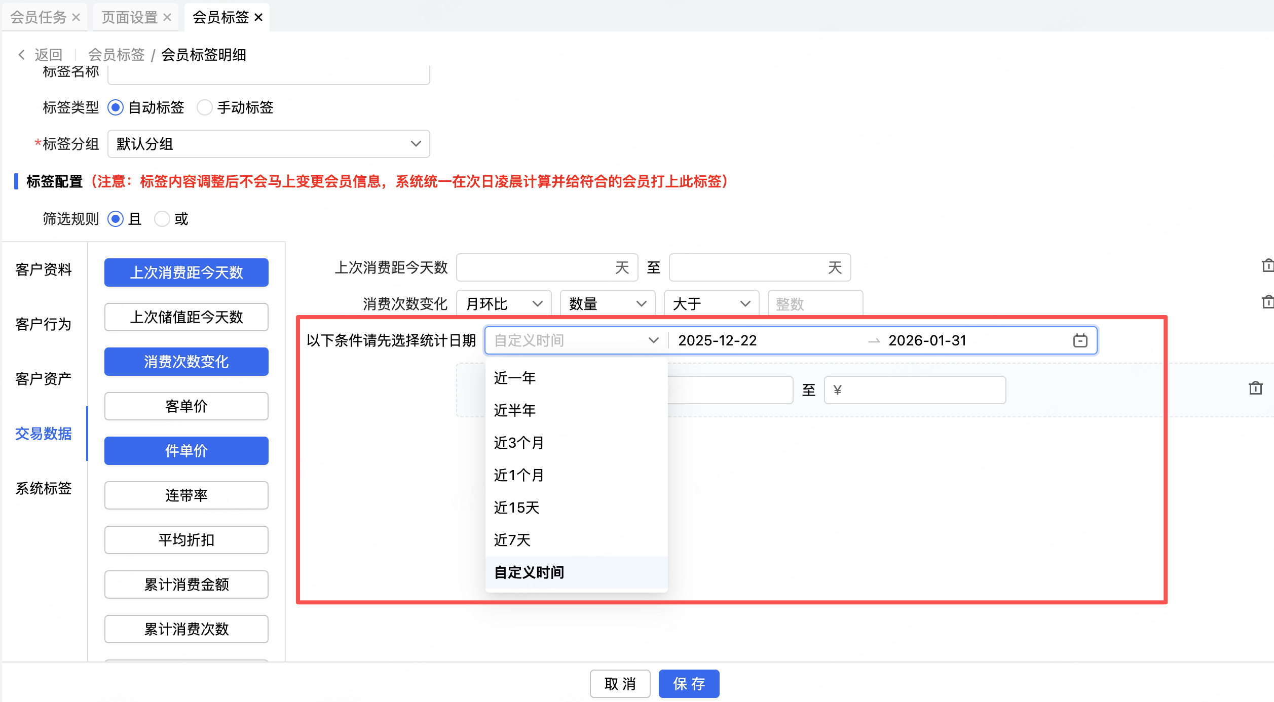 2、针对新建标签中带有订单相关的统计数据,例如:客单价、连带率、累计消费金额等条件,且时间范围为自定义时间时,将会根据自定义时间的开始时间顺延2年,视作该标签的过期时间