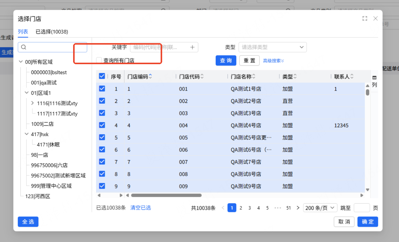 筛选条件“要货门店”,筛选界面增加勾选“查询所有门店”,默认不勾选。