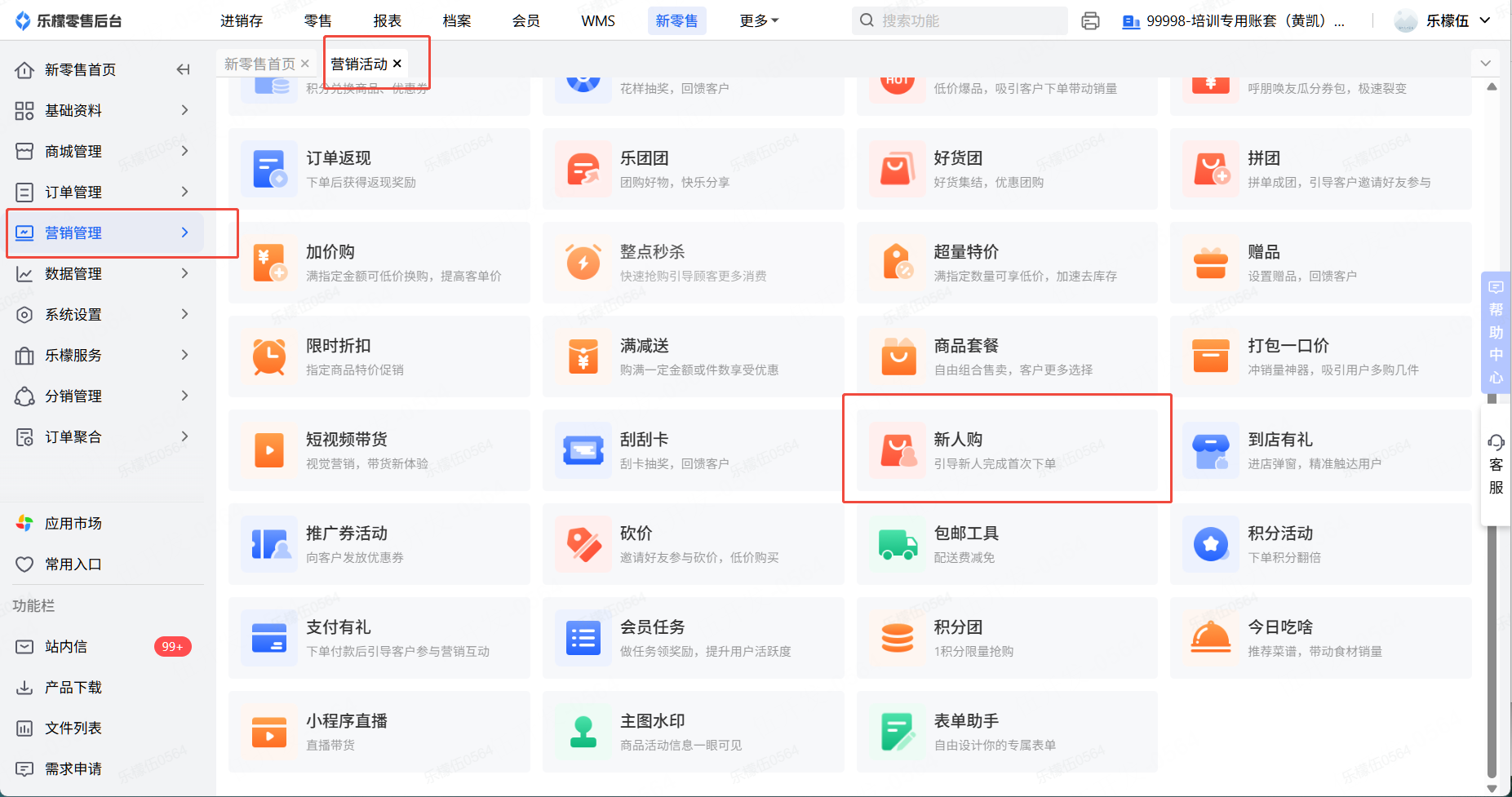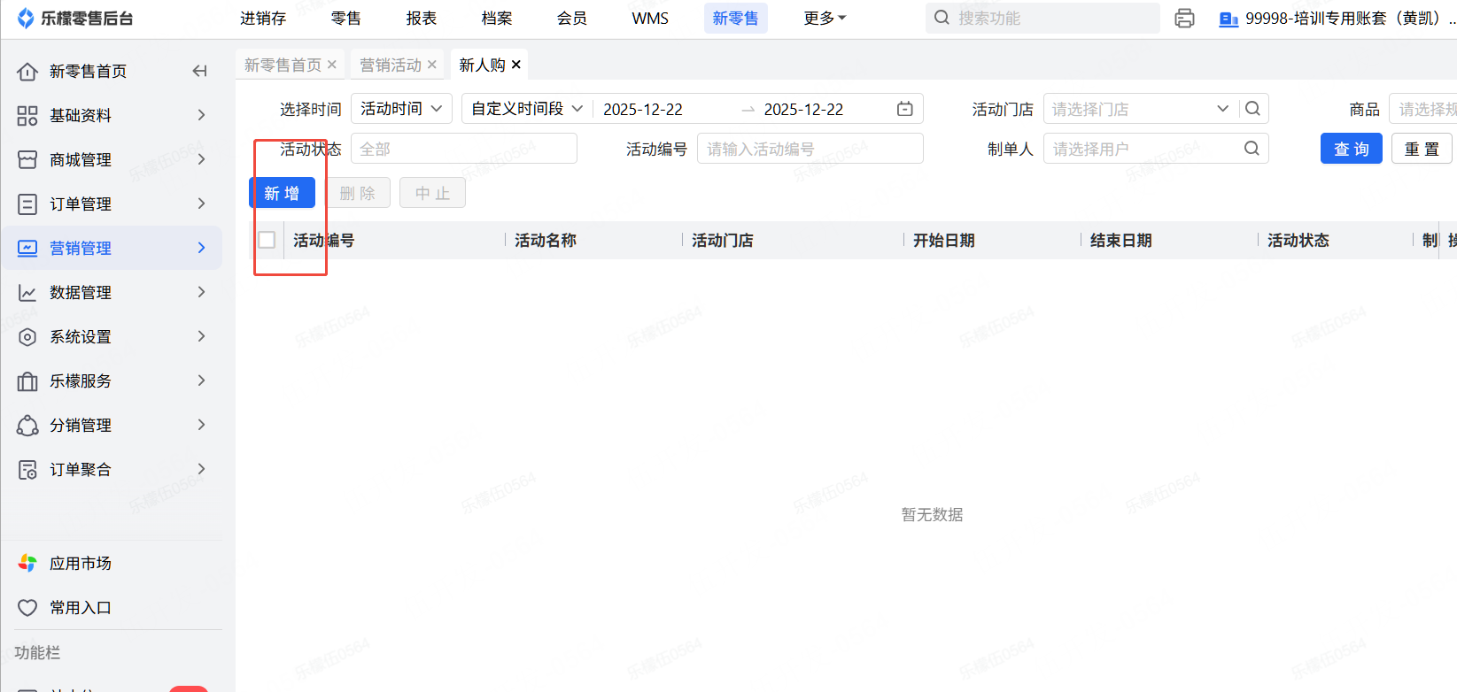 👉【操作路径】:1.新零售 - 2.营销管理 ,营销活动- 3.选择新人购,点击新增
