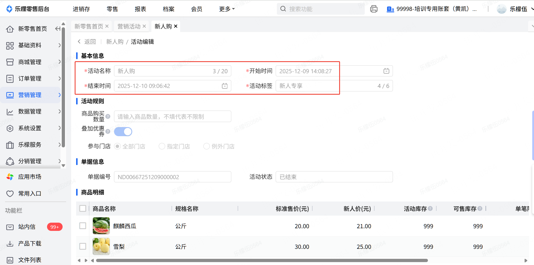 创建一个,新人购活动,活动时间为12月9日到12月10日结束,新人购活动商品,使用麒麟西瓜和雪梨