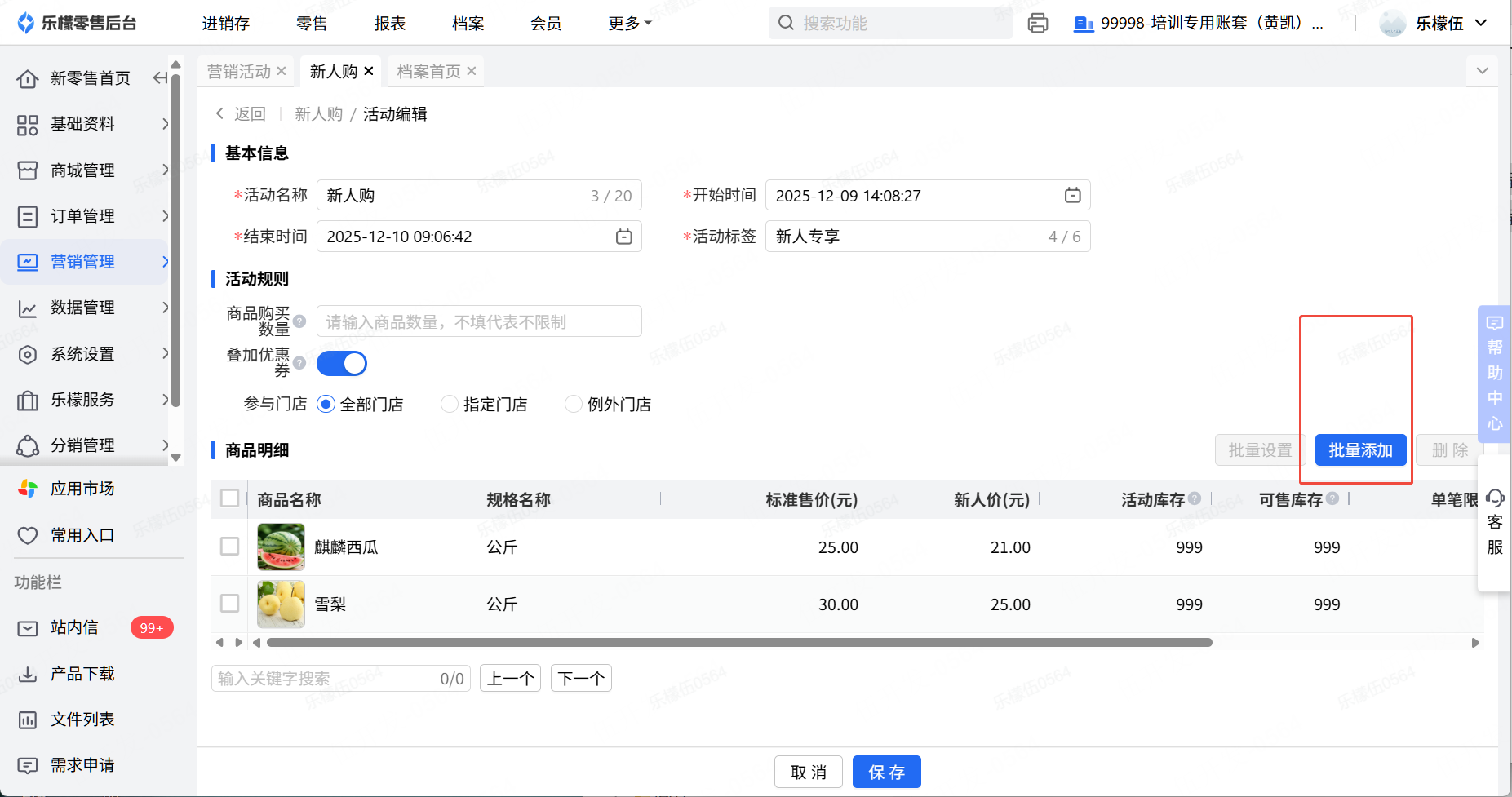 👉【操作路径】:6.批量添加,选择麒麟西瓜和雪梨 - 7.设置好新人价
