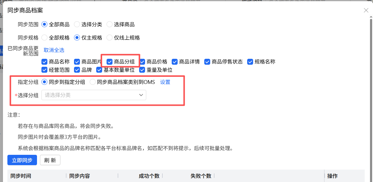 要点:原同步商品时,商家需要先选同步分组,交互不便于理解。因此调整同步档案商品时的交互。