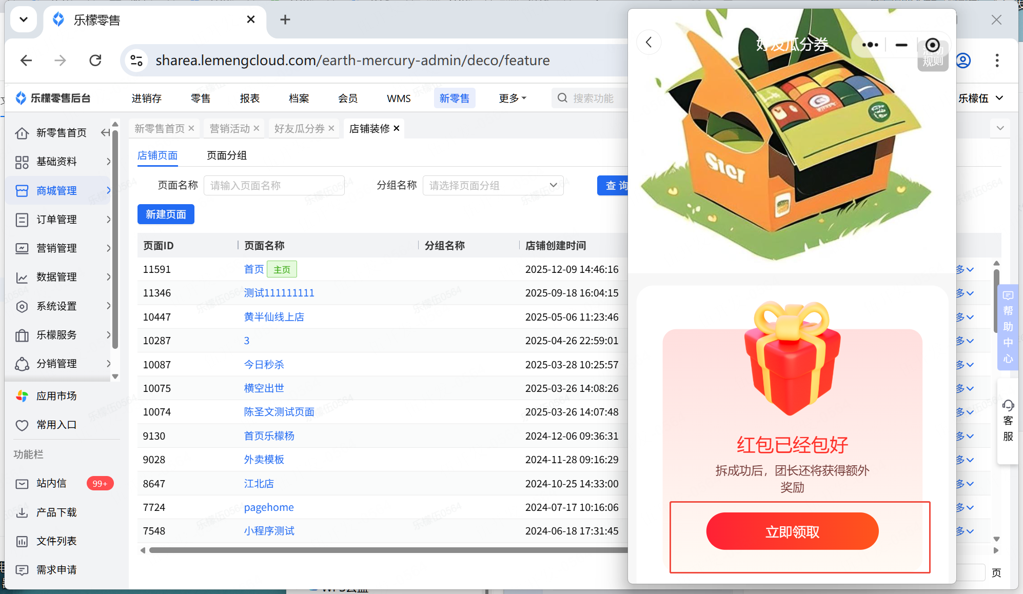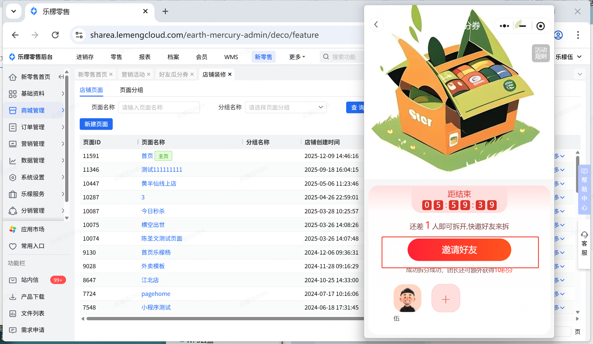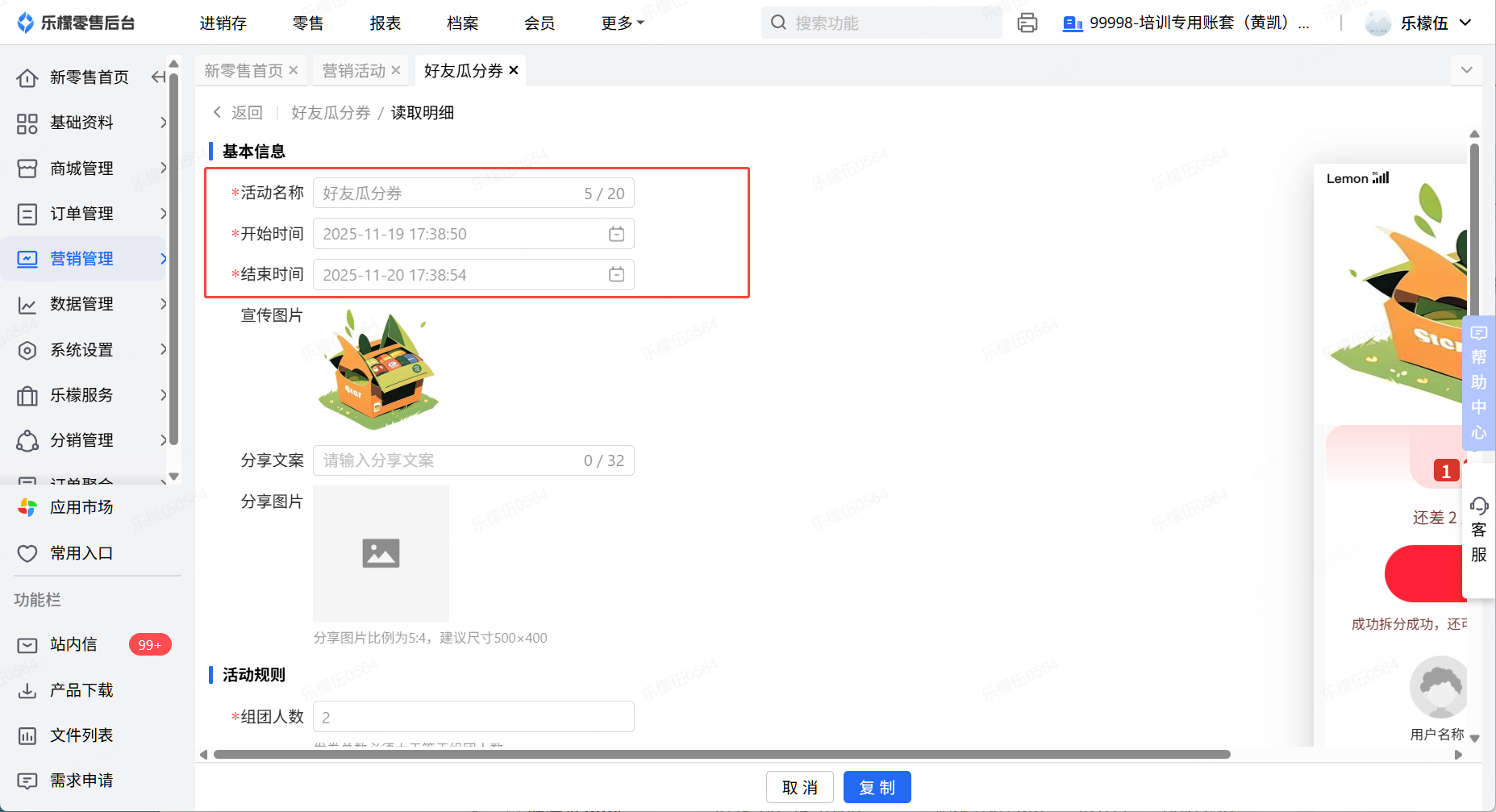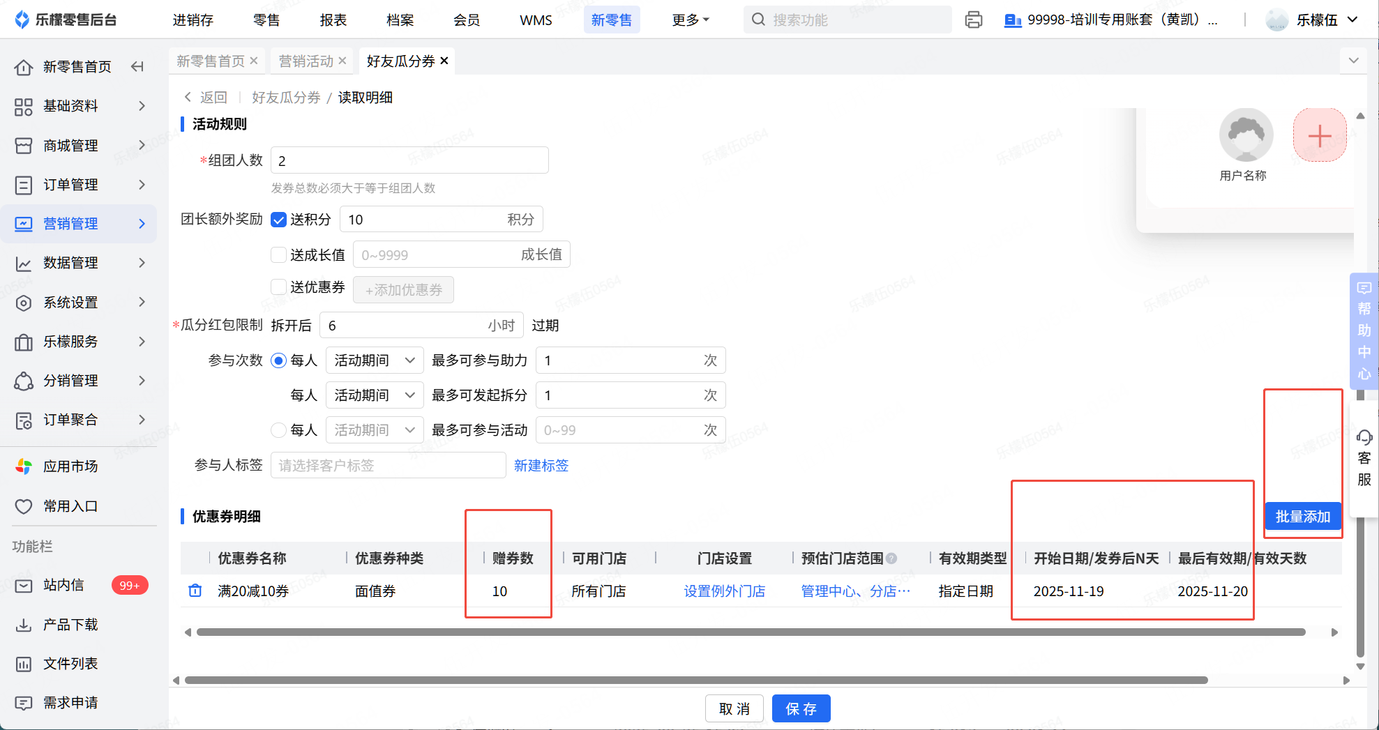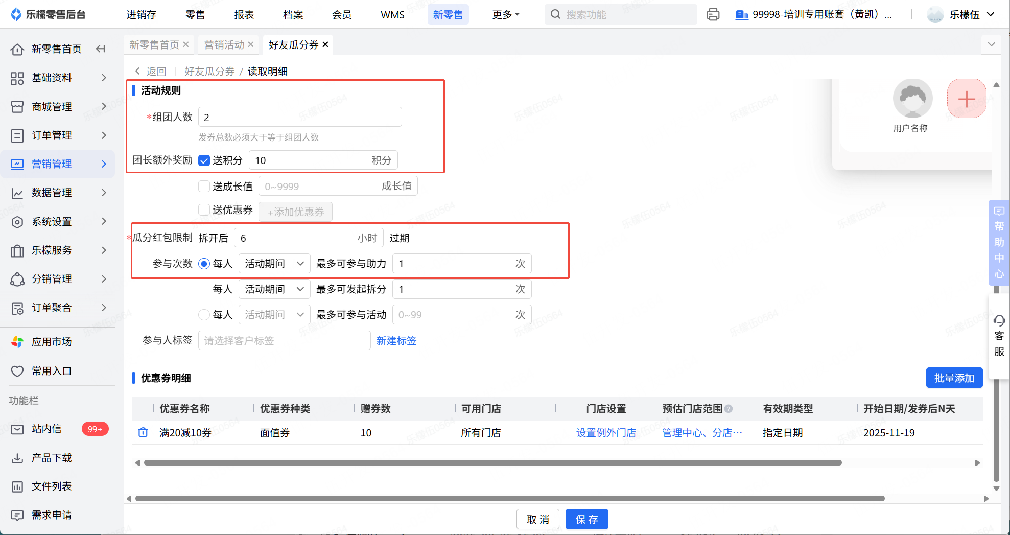 👉【操作路径】:1.新零售 - 2.营销管理,营销活动 - 3.好友瓜分券,新增