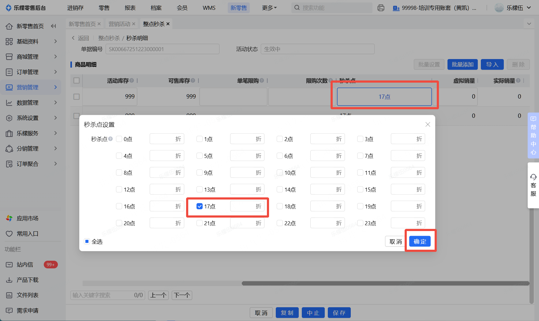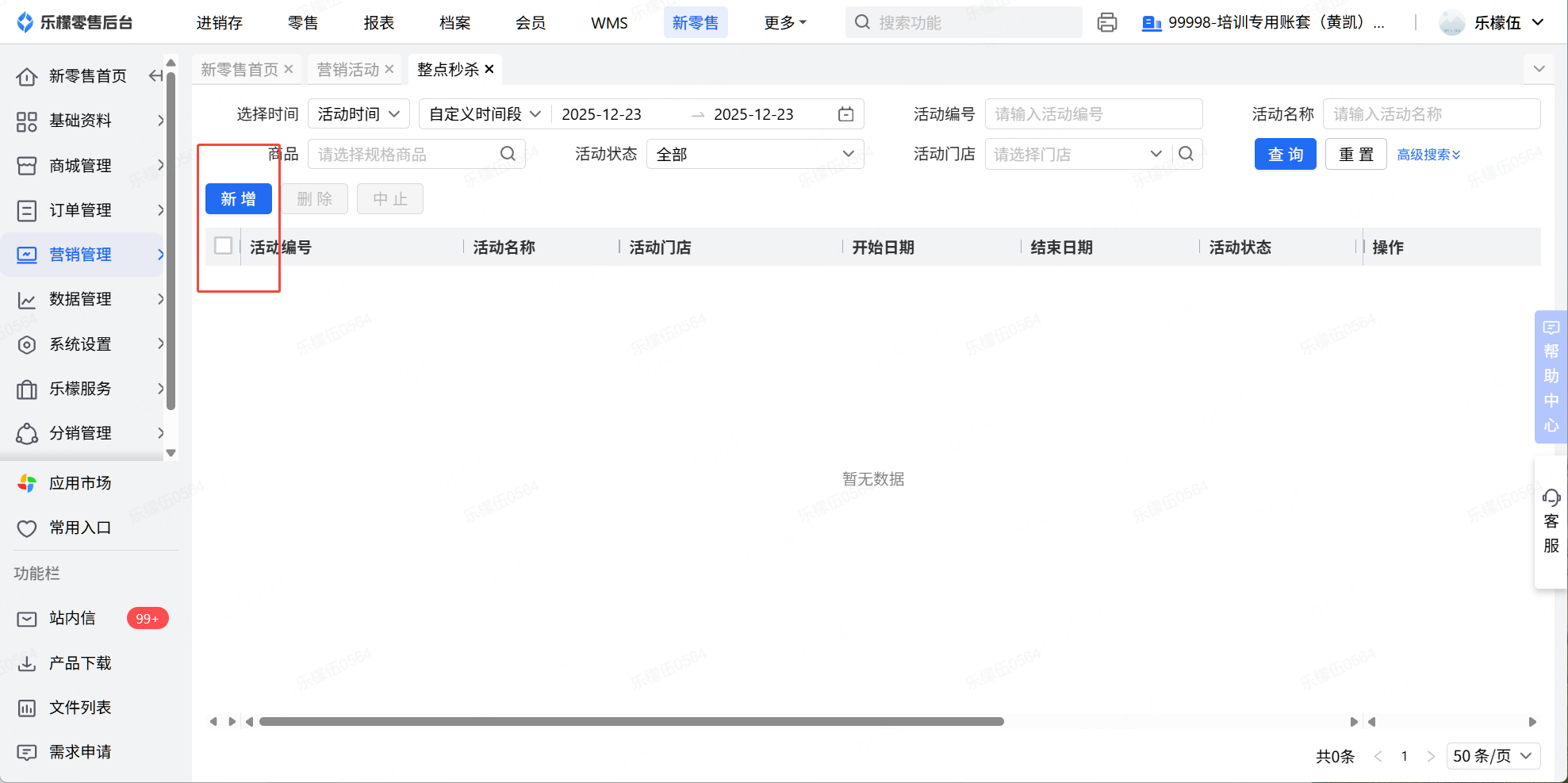 👉【操作路径】:1.新零售 - 2.营销管理,营销活动 - 3.点击整点秒杀 - 4.点击新增