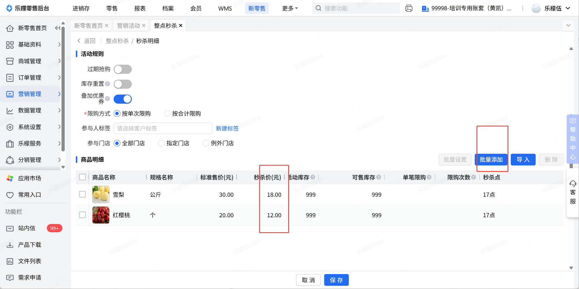 👉【操作路径】:7.批量添加,选择商品雪梨和红樱桃 - 8.设置秒杀价 - 7.设置秒杀时间,保存
