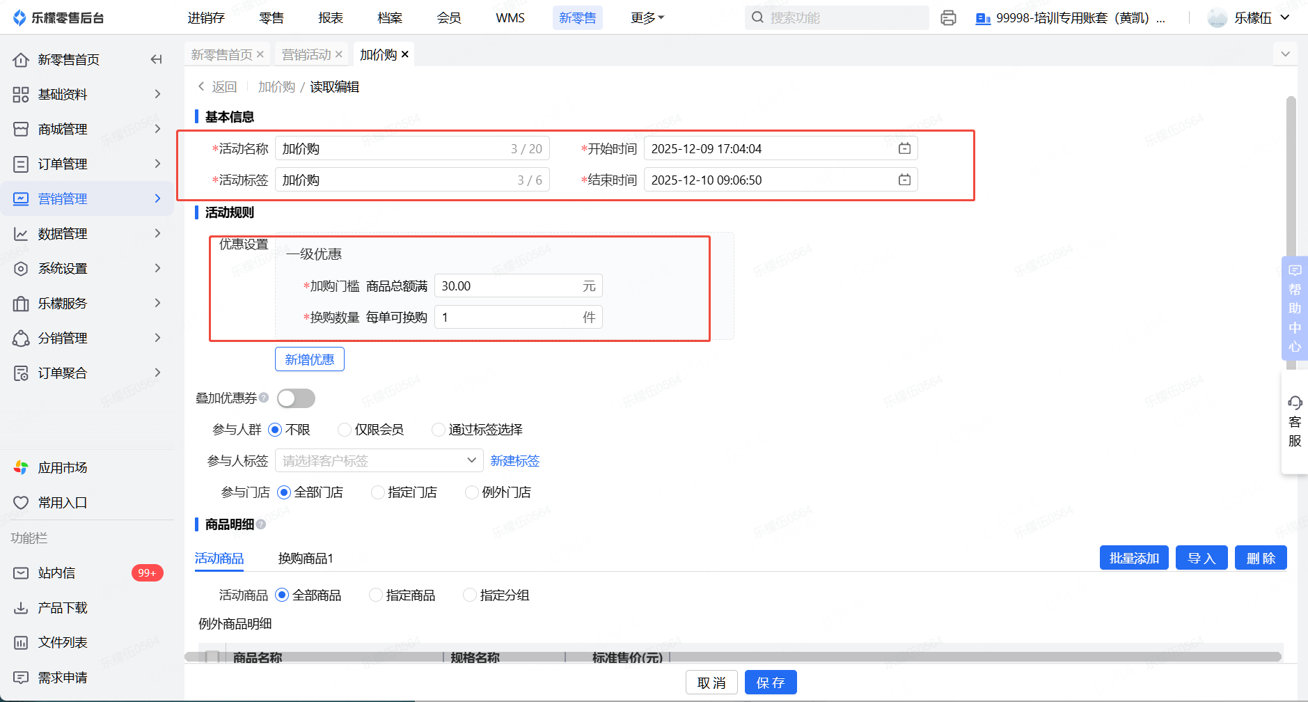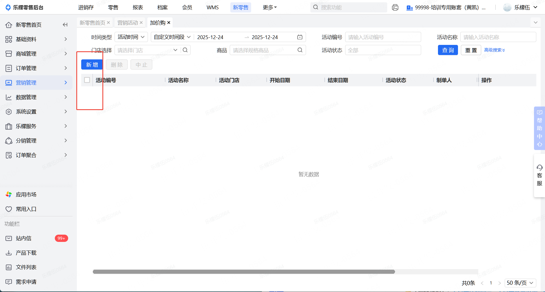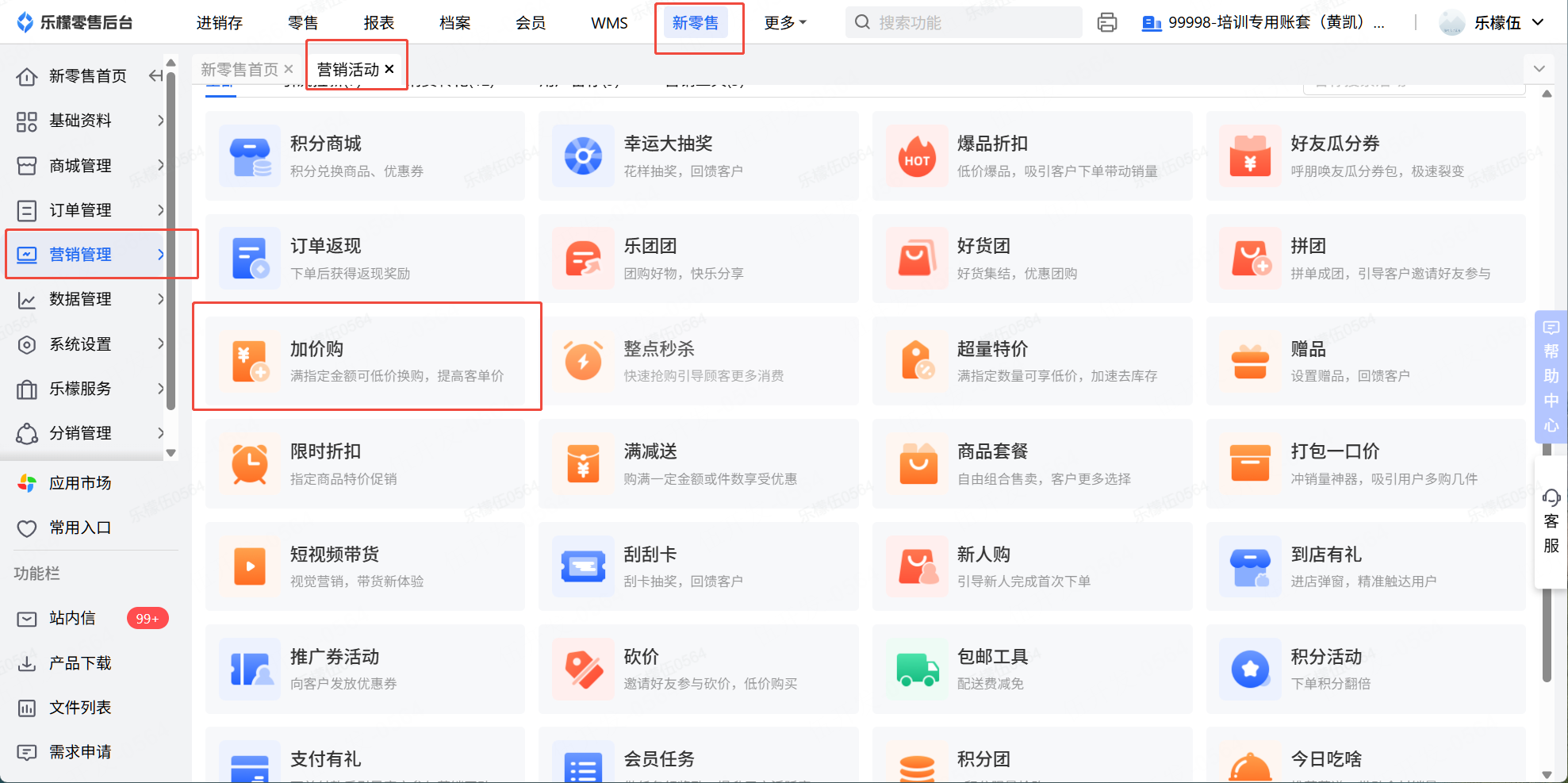 👉【操作路径】:1.登录后台进入乐檬零售模块 - 2.点击新零售模块,营销管理 - 3.选择加价购,点击新增