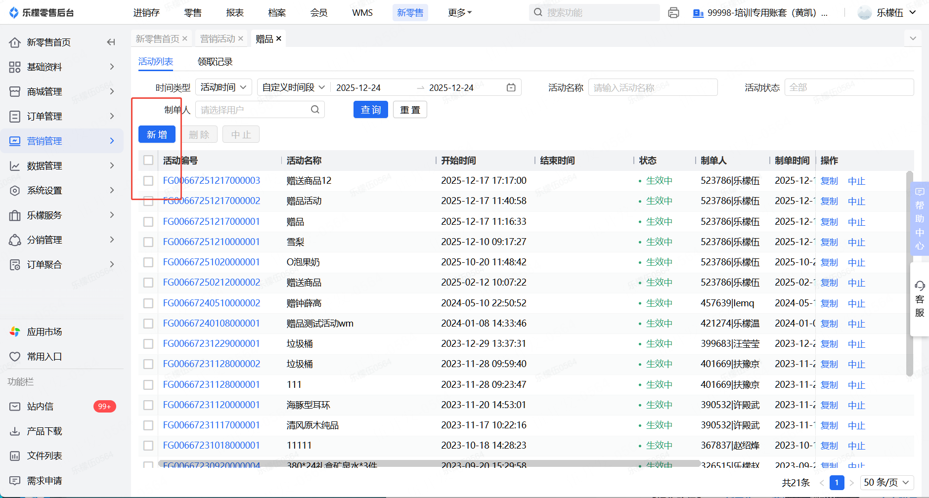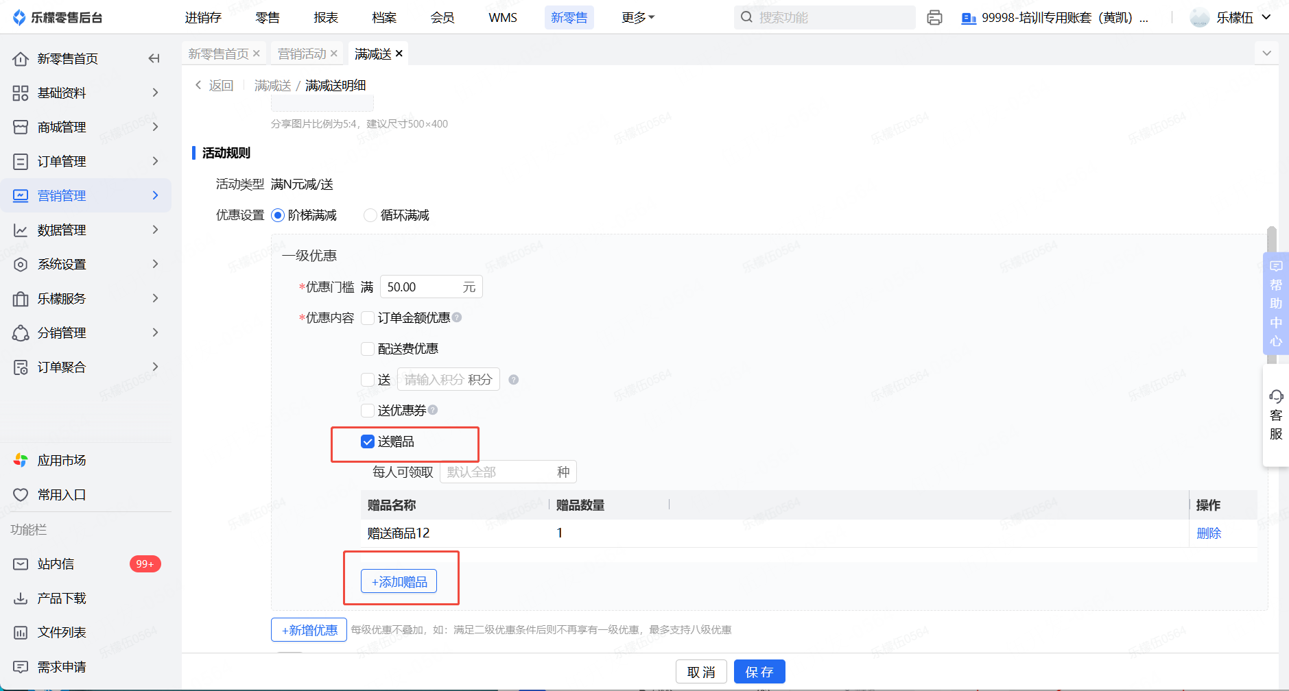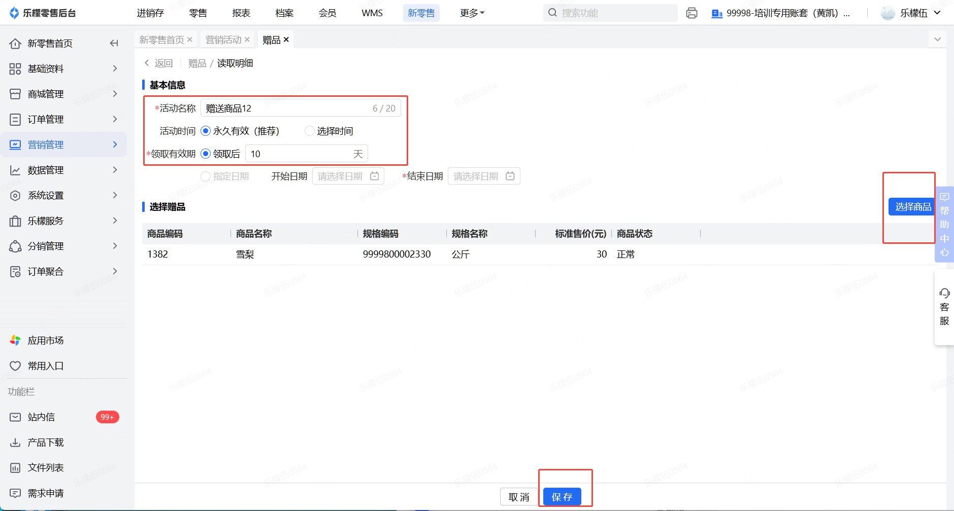 👉【操作路径】:1.新零售 - 2.营销管理,营销活动 - 3.点击赠品,新增