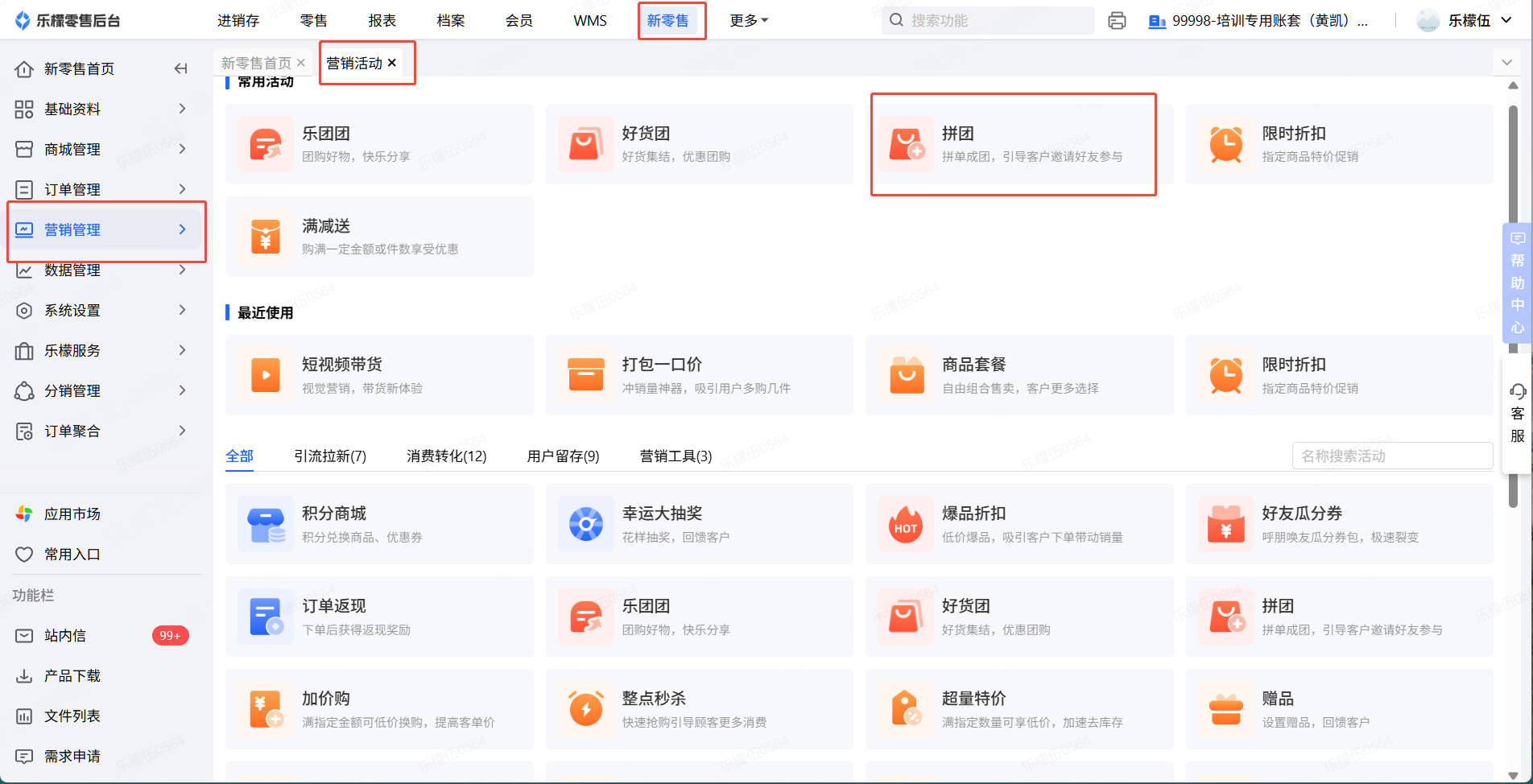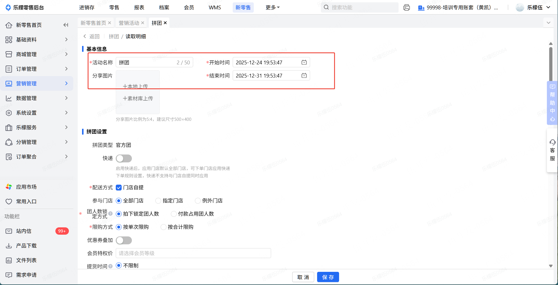 👉【操作路径】:1.新零售 - 2.营销管理,营销管理 - 3.拼团,新增官方团