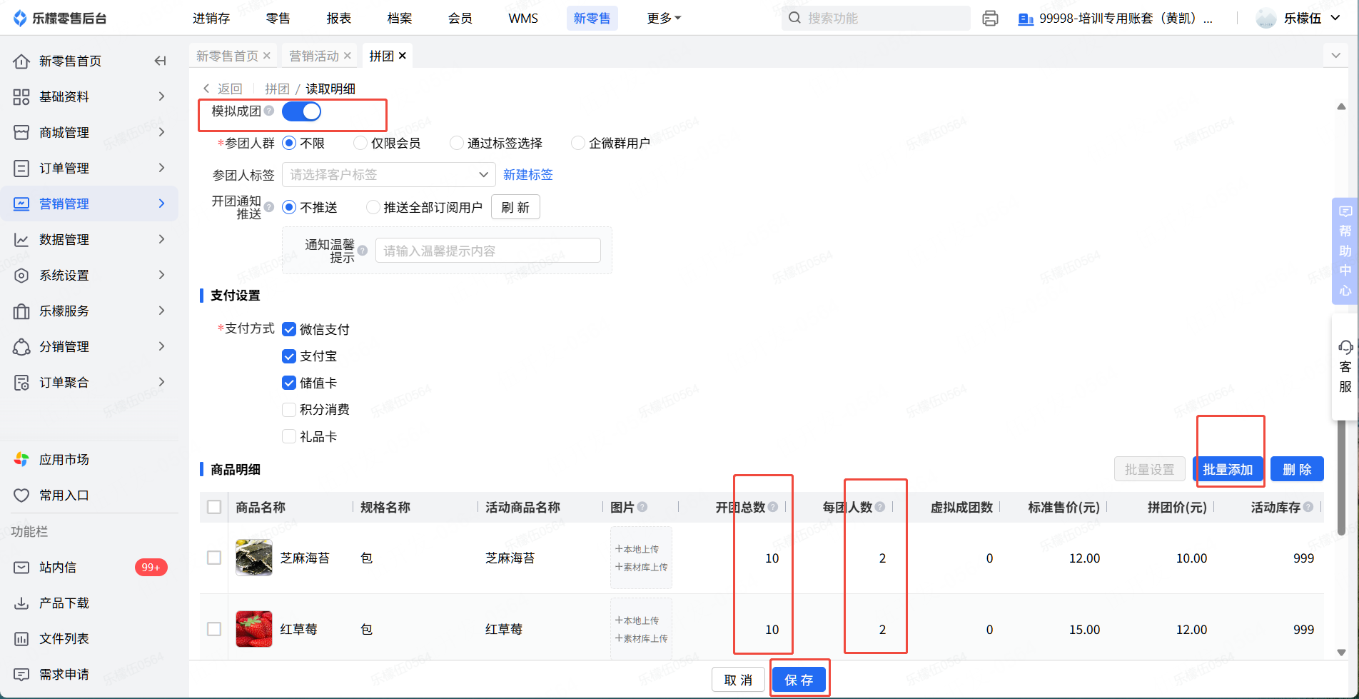 👉【操作路径】:6.开启虚拟成团 - 7.批量添加,选择芝麻海苔和红草莓 - 8.开团总数设置10,每团人数设置2,保存