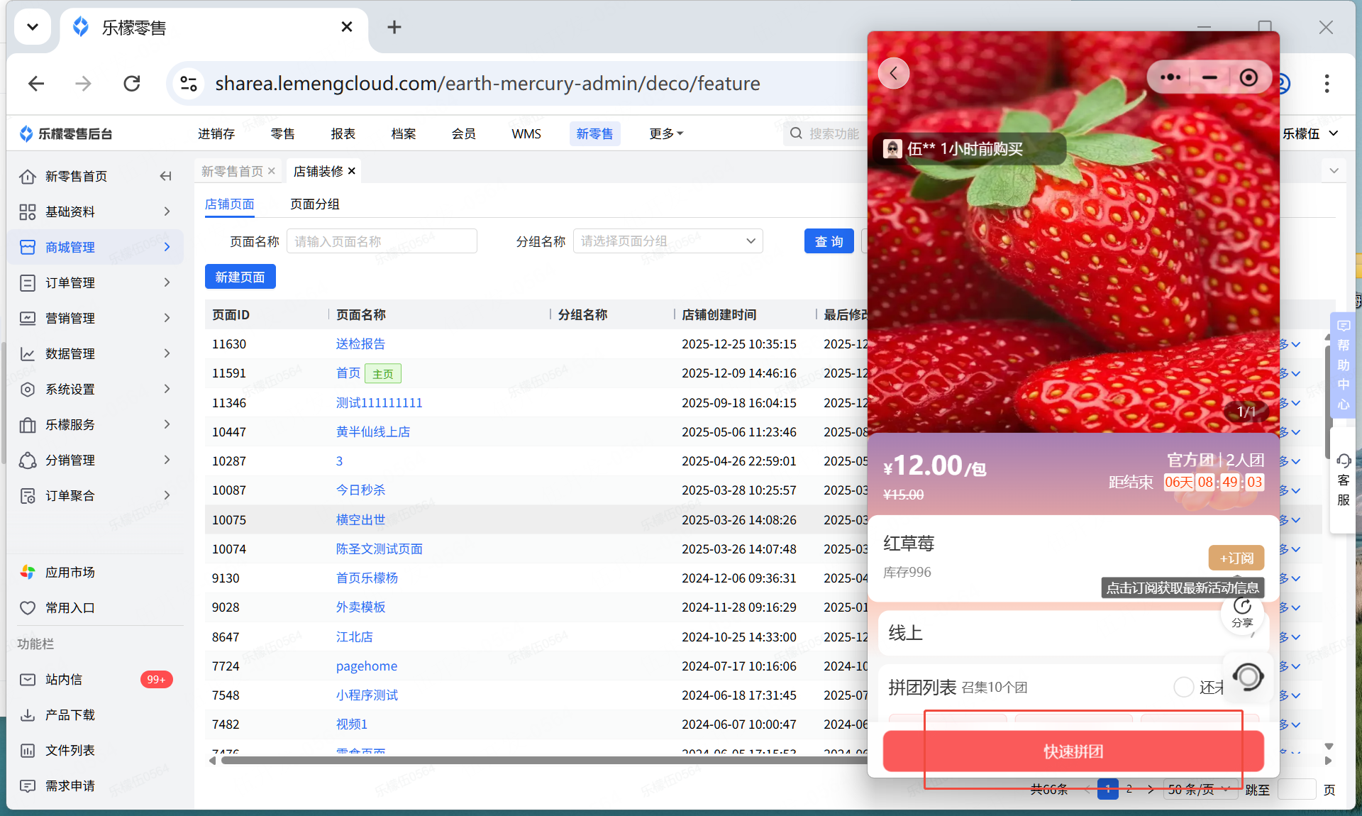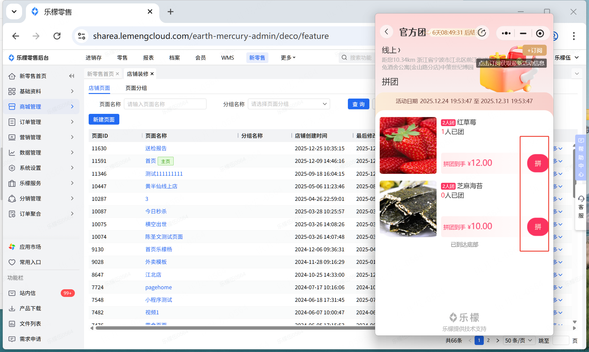 创建一个,红草莓和芝麻海苔的拼团活动,每个商品开团总数为10,拼团人数为2。活动时间在12月24日到12月31日结束