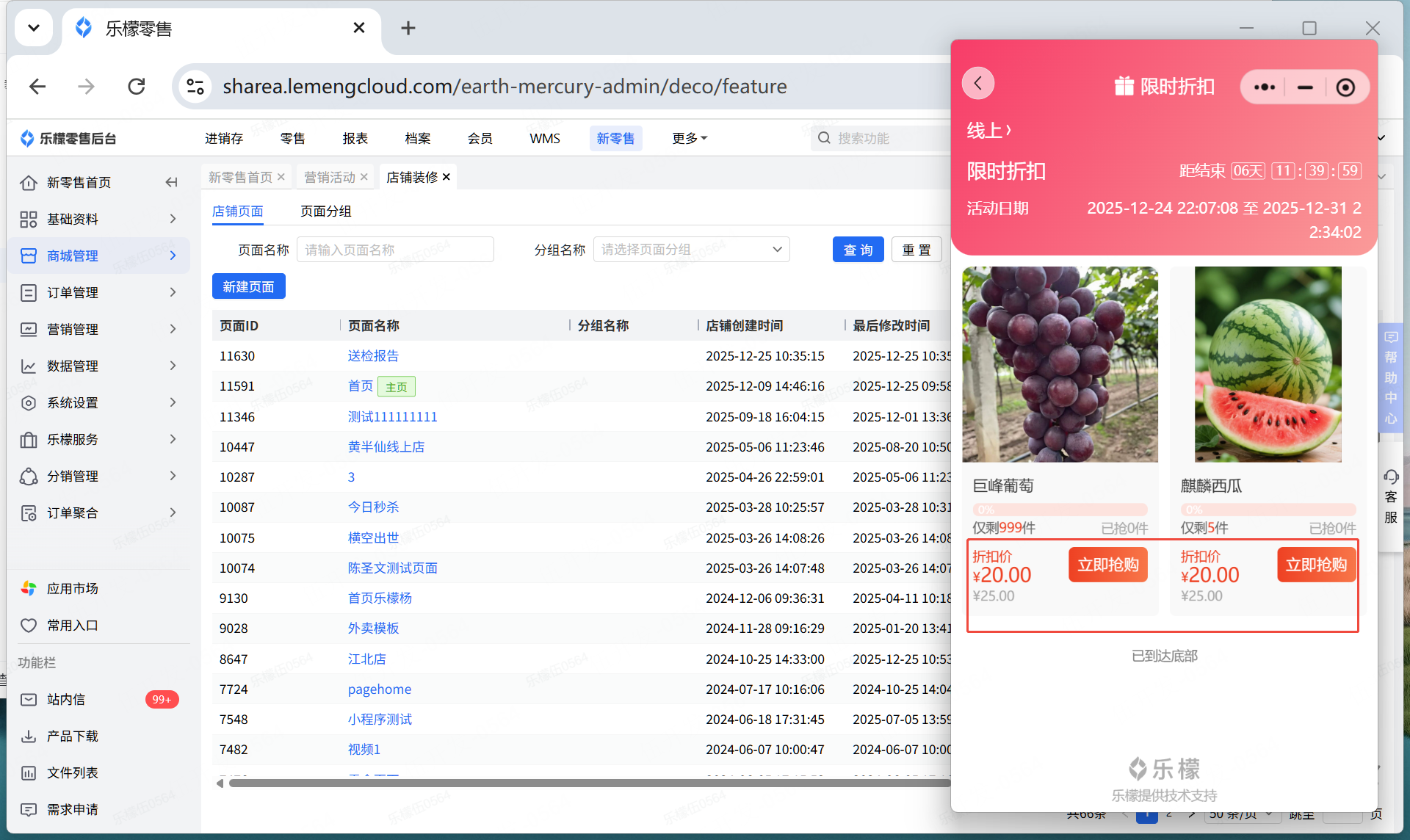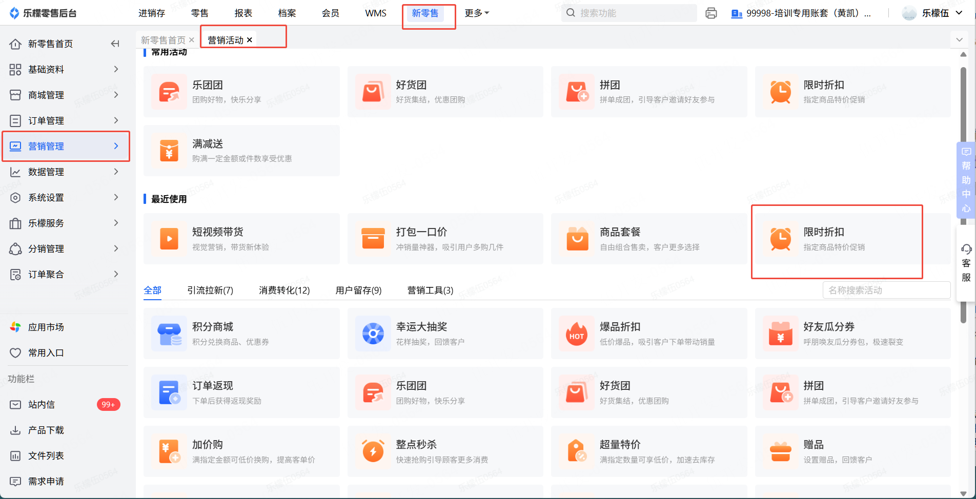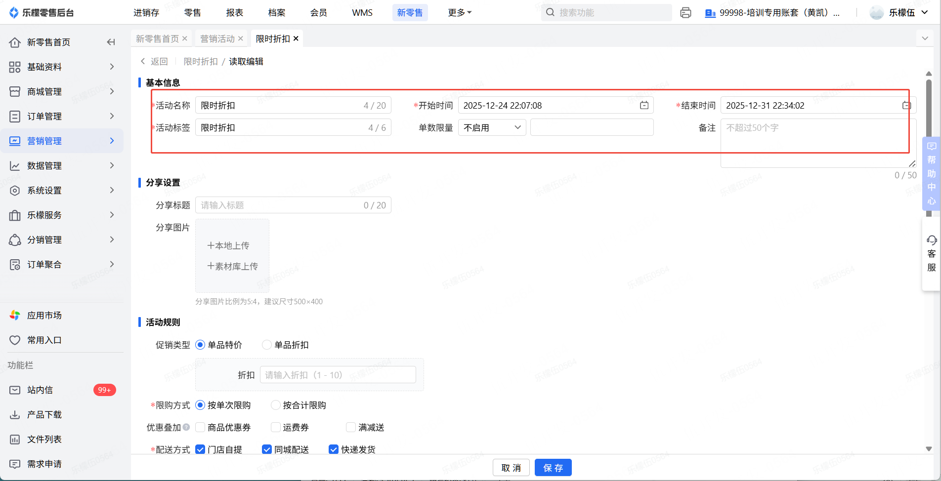 👉【操作路径】:1.新零售 - 2.营销管理,营销活动 - 3.点击限时折扣,新增