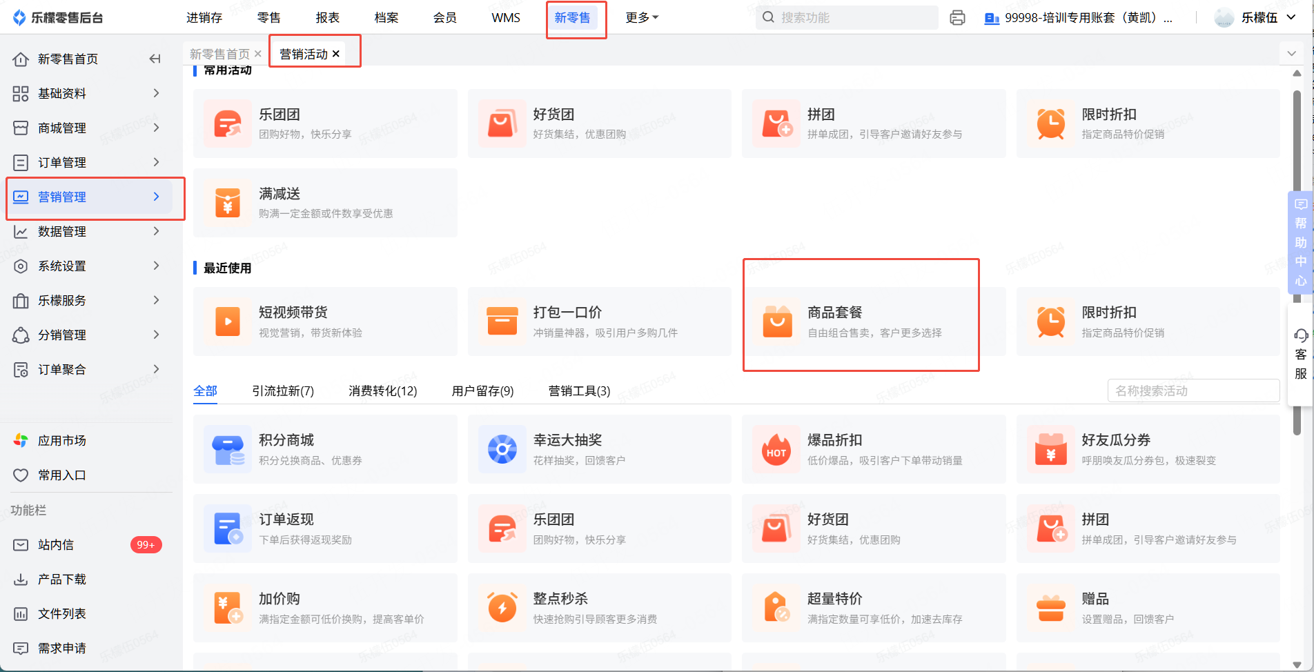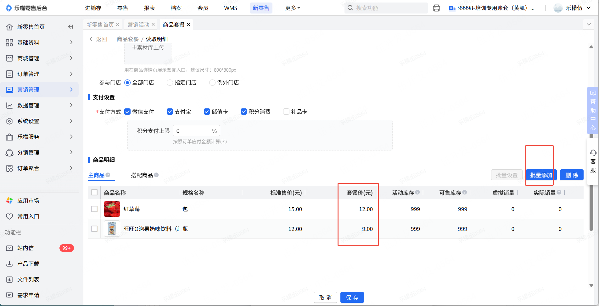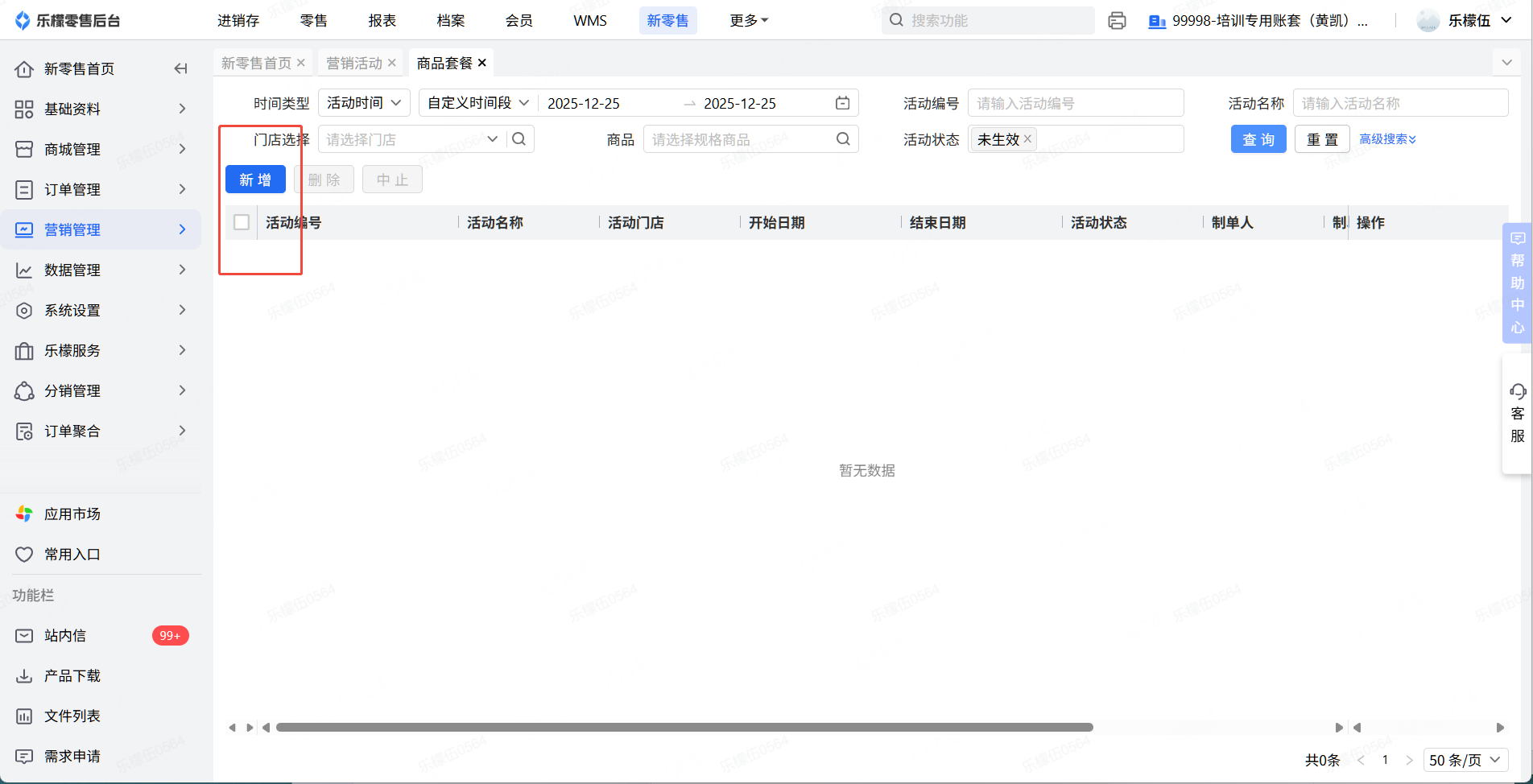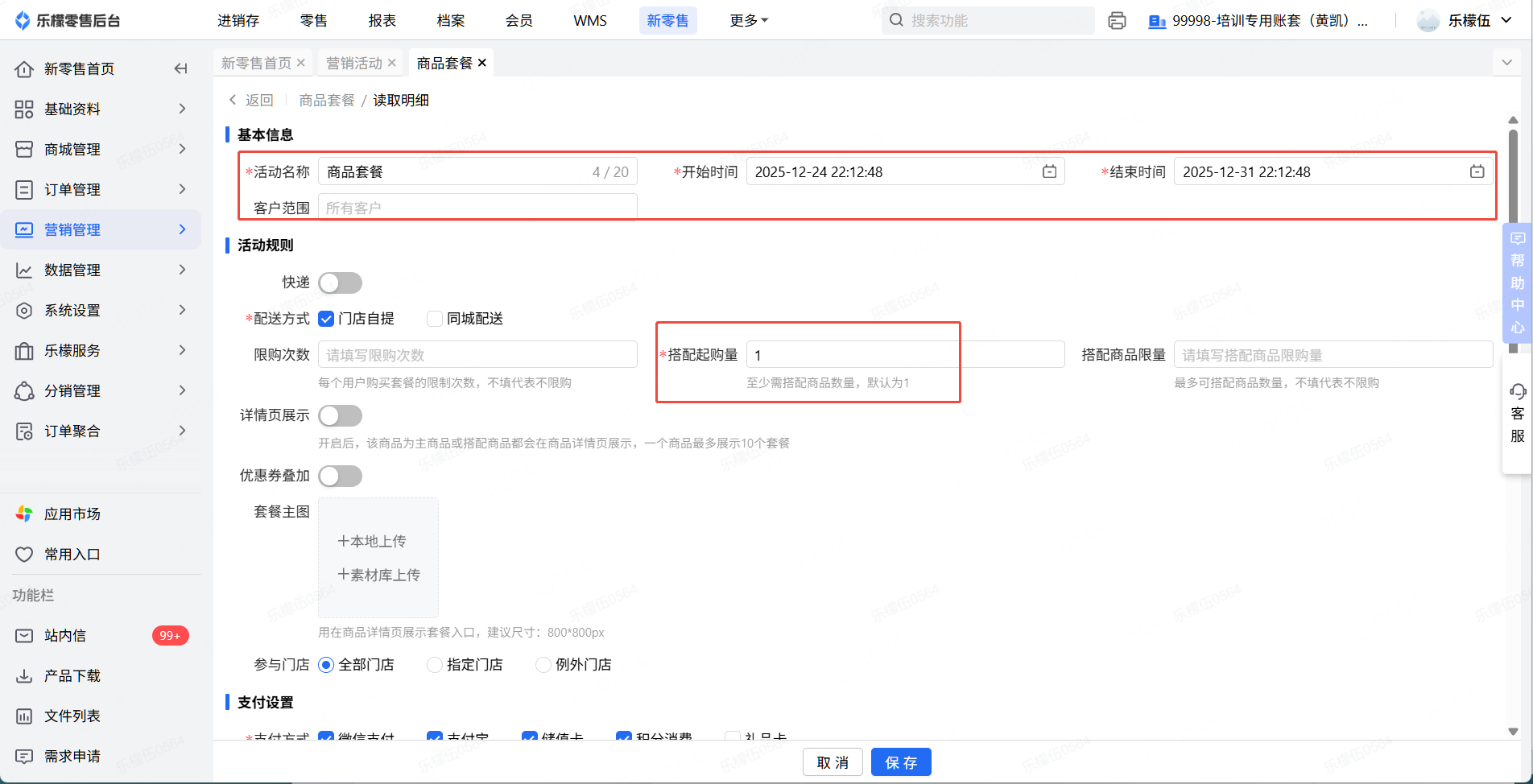 👉【操作路径】:1.新零售 - 2.营销管理,营销活动 - 3.点击商品套餐,新增