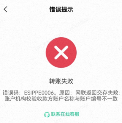 报错:网联返回交存失败:账户机构校验收款方账户名称与账户编号不一致
