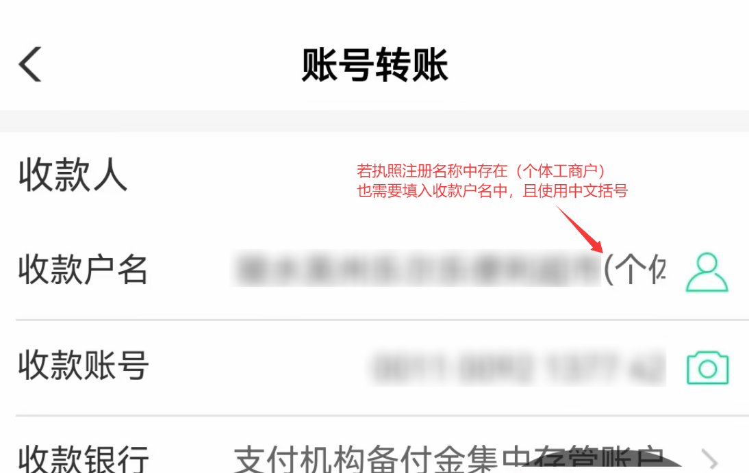 需要核实转账信息是否正常,若执照的注册名称中存在(个体工商户)字样,也需要填入,并且使用中文的括号,使用英文的括号符也无法转账成功
