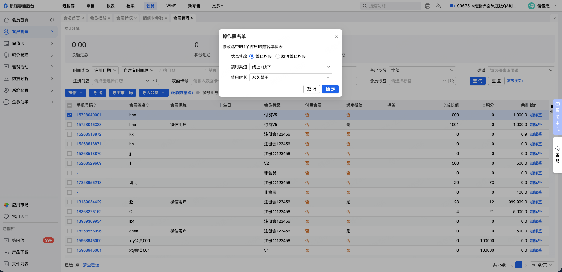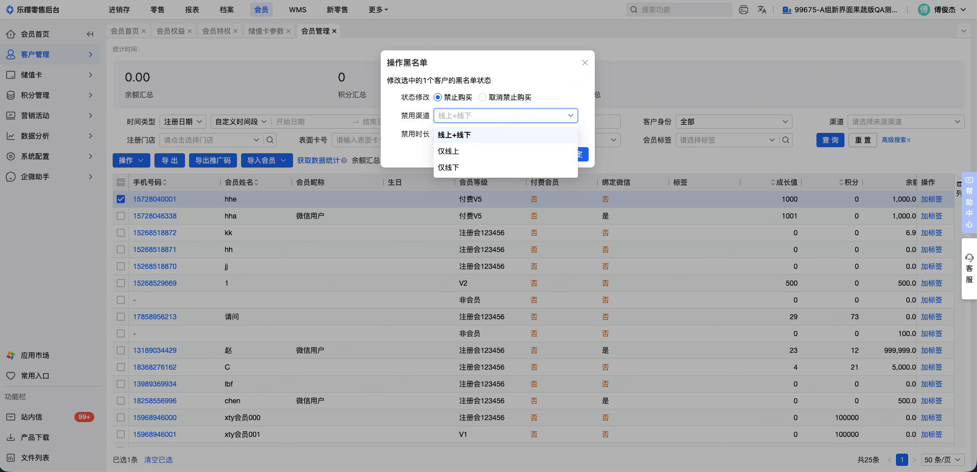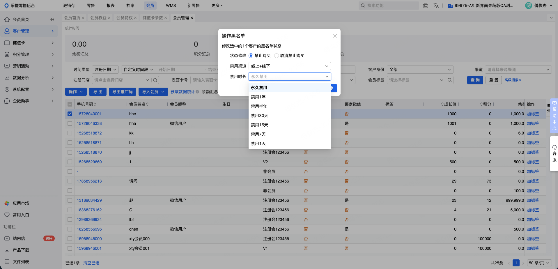 全渠道会员-会员管理-加黑名单,现支持禁用渠道+禁用时长