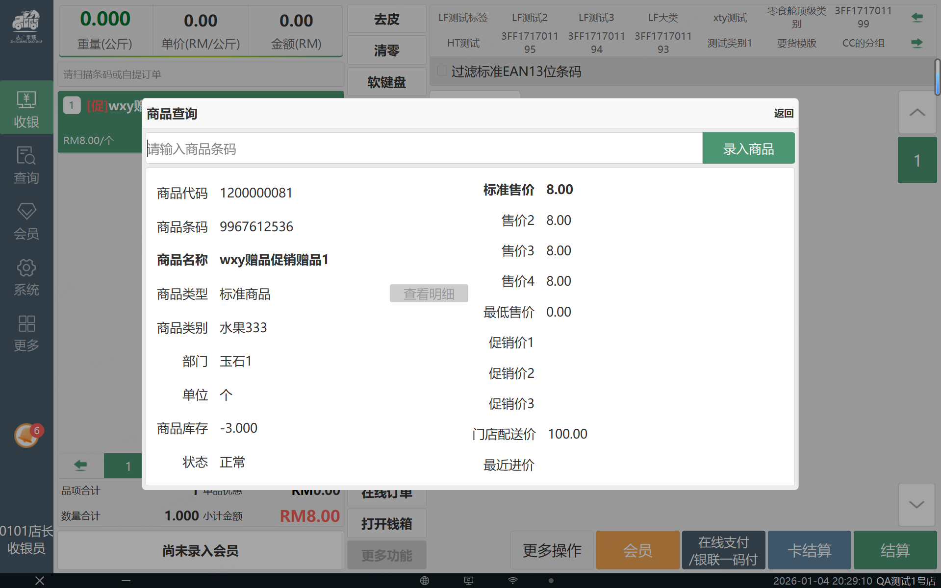在选中已录入商品时,点击商品查询功能按钮,直接以当前商品进行商品查询相关数据展展示