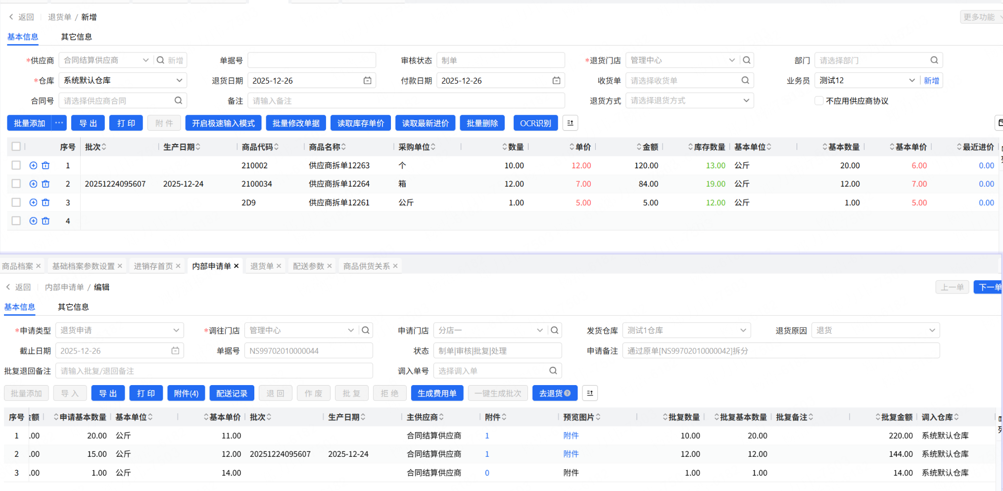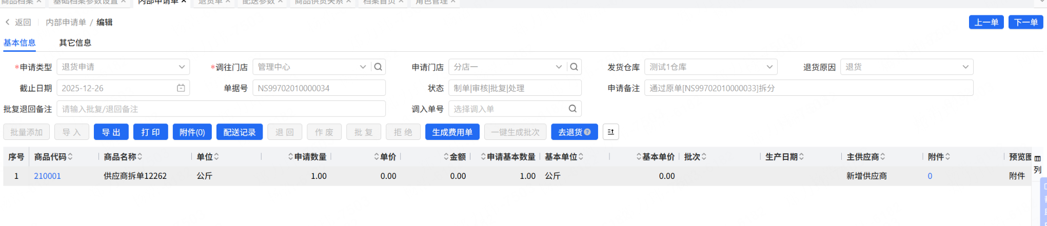 门店因各种商品原因退货给总部,总部需要整合后退至供应商,包括商品附件一并推给供应商。我节省操作流程,支持内部申请单退货申请单据生成退货单