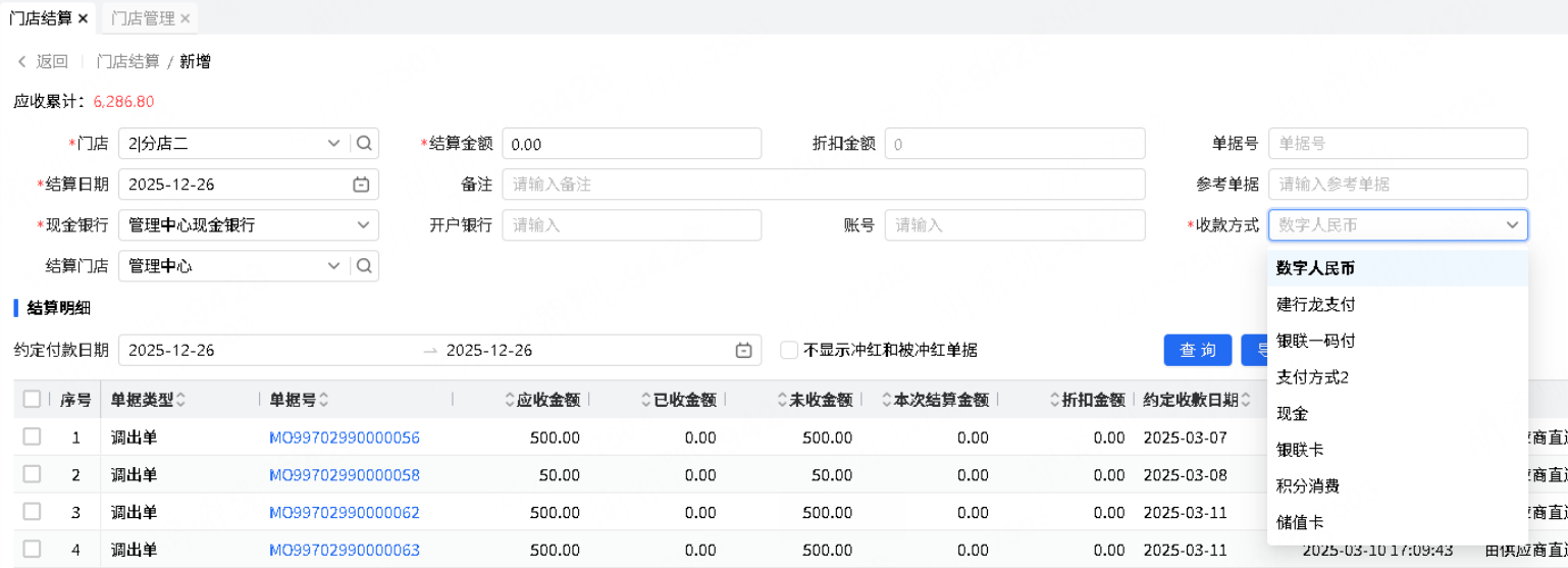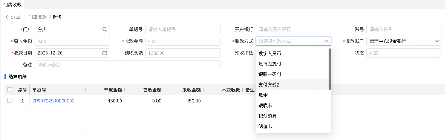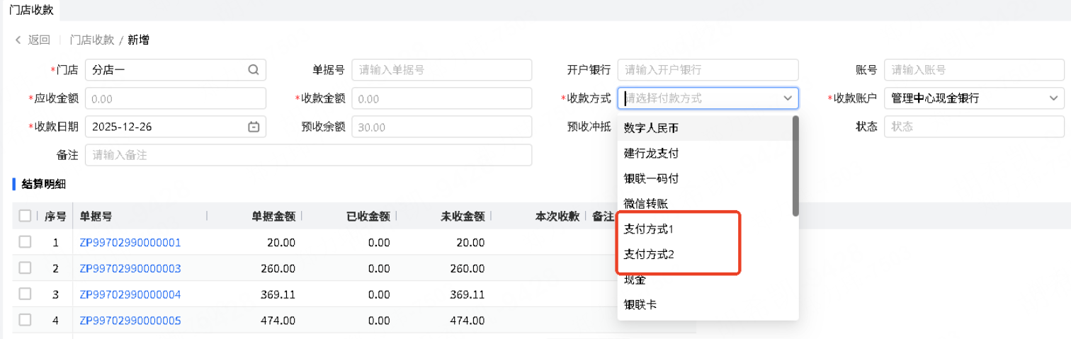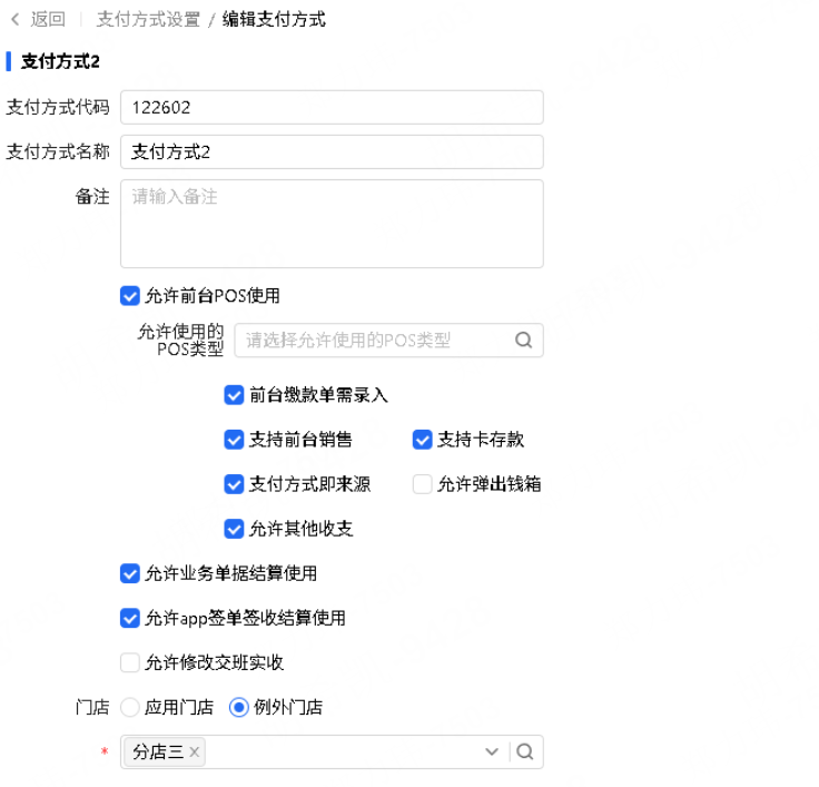 支付方式应用“门店”,即门店结算选择“支付方式”、门店付款选择“支付方式”,根据支付方式的门店和结算门店、付款门店过滤支付方式。
