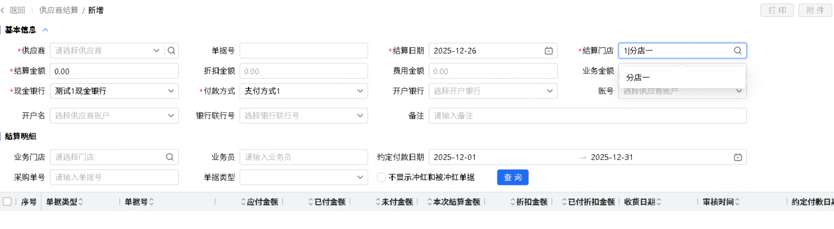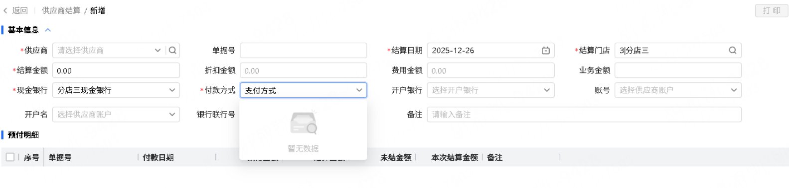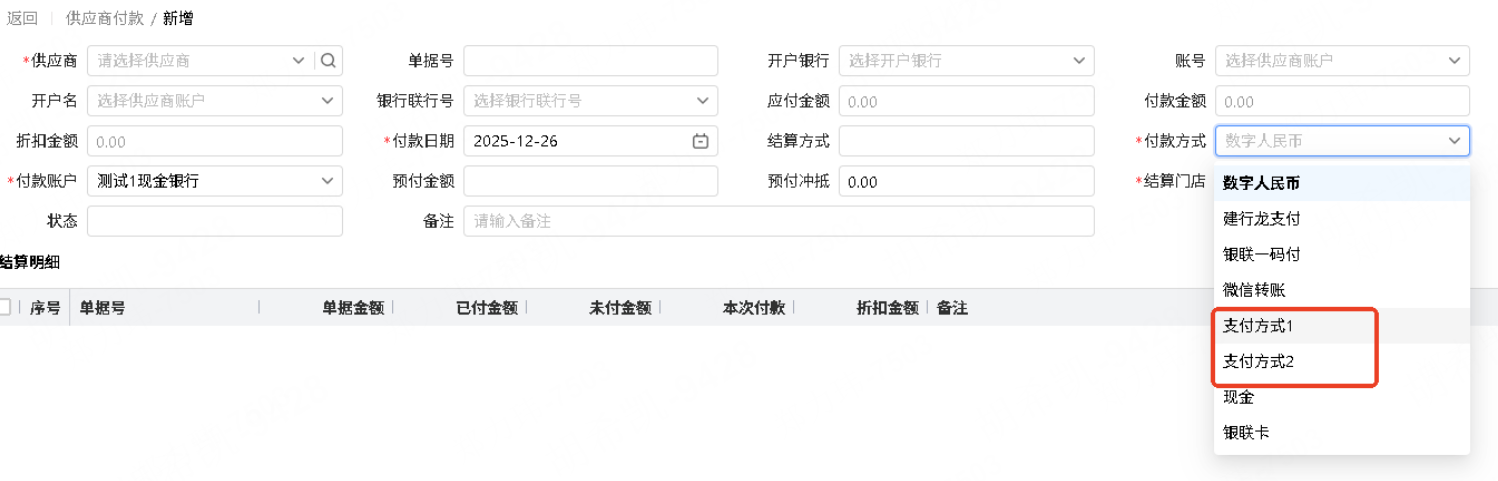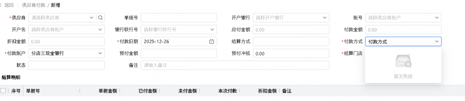 支付方式应用“门店”,即供应商结算选择“支付方式”、供应商付款选择“支付方式”,根据支付方式的门店和结算门店、付款门店过滤支付方式。