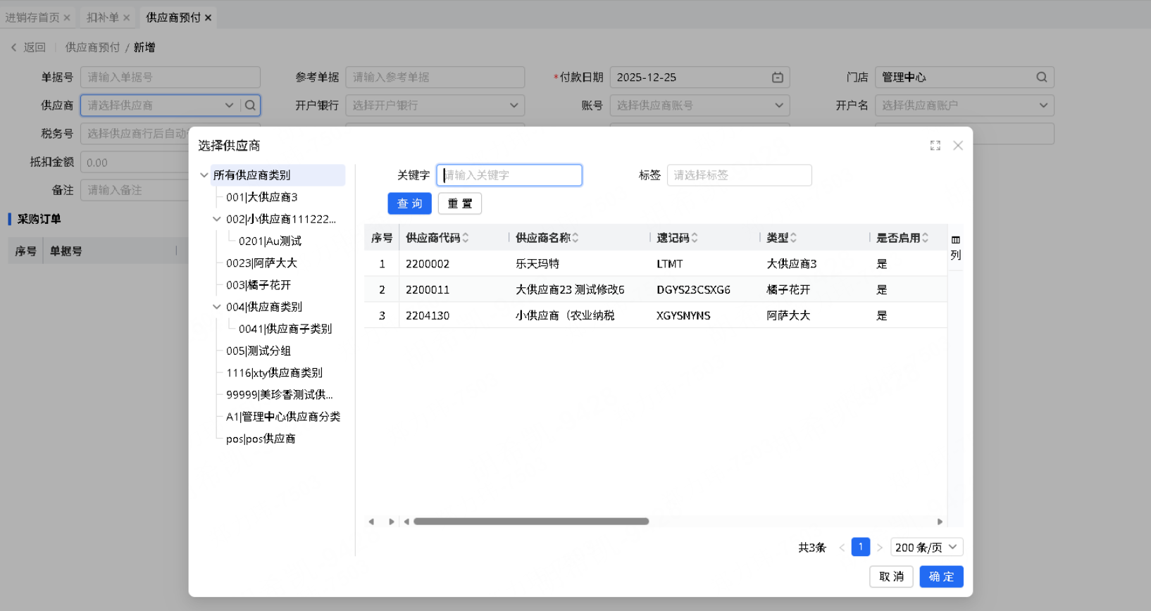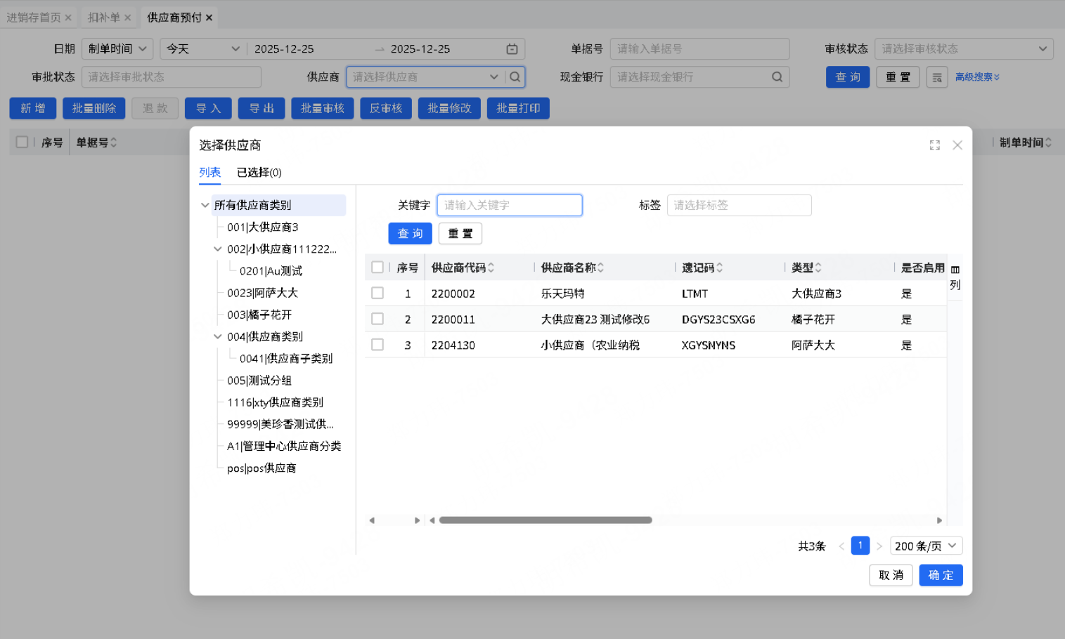 供应商预付支持按用户选择的供应商过滤供应商