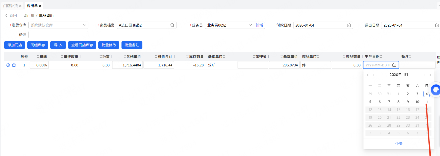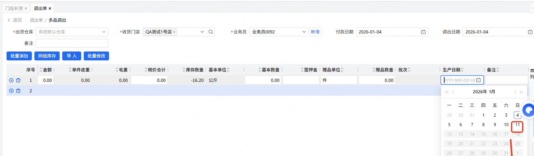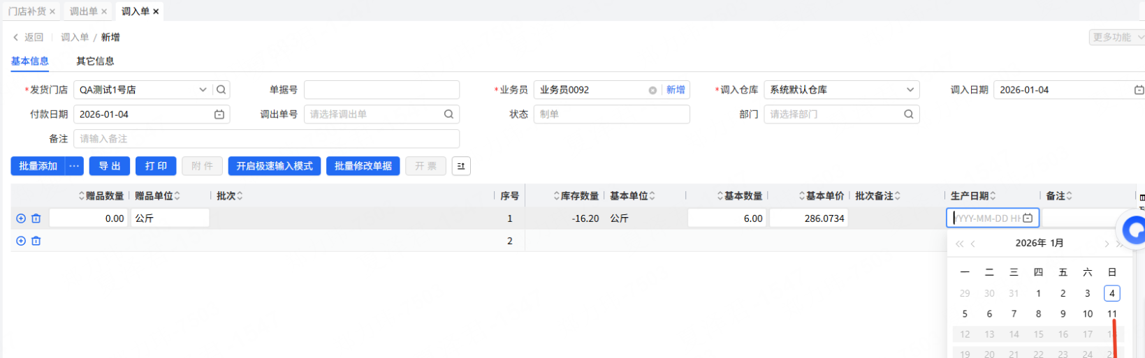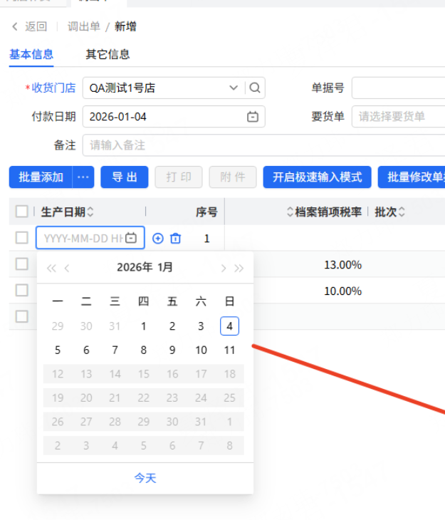 客户水果的生产日期实际填写的是上市日期,单据一般都是提前一天做的,所以需要开放未来一天日期