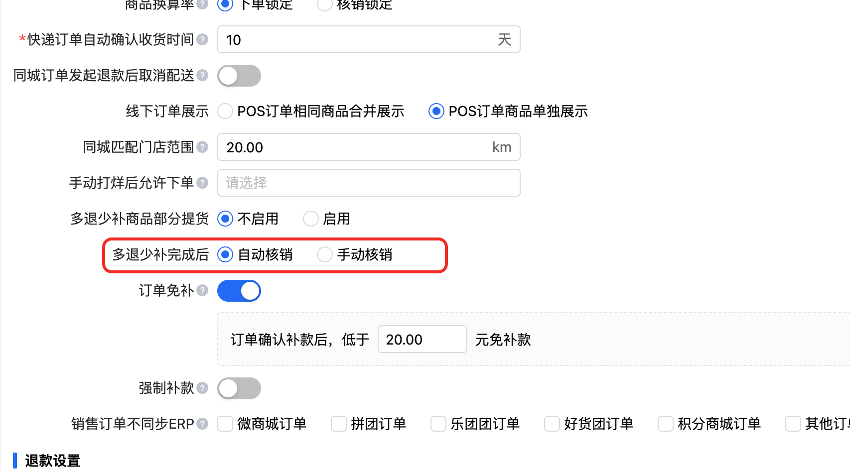 功能通过参数控制:通用设置-订单设置-多退少补完成后,默认自动核销,可选手动核销