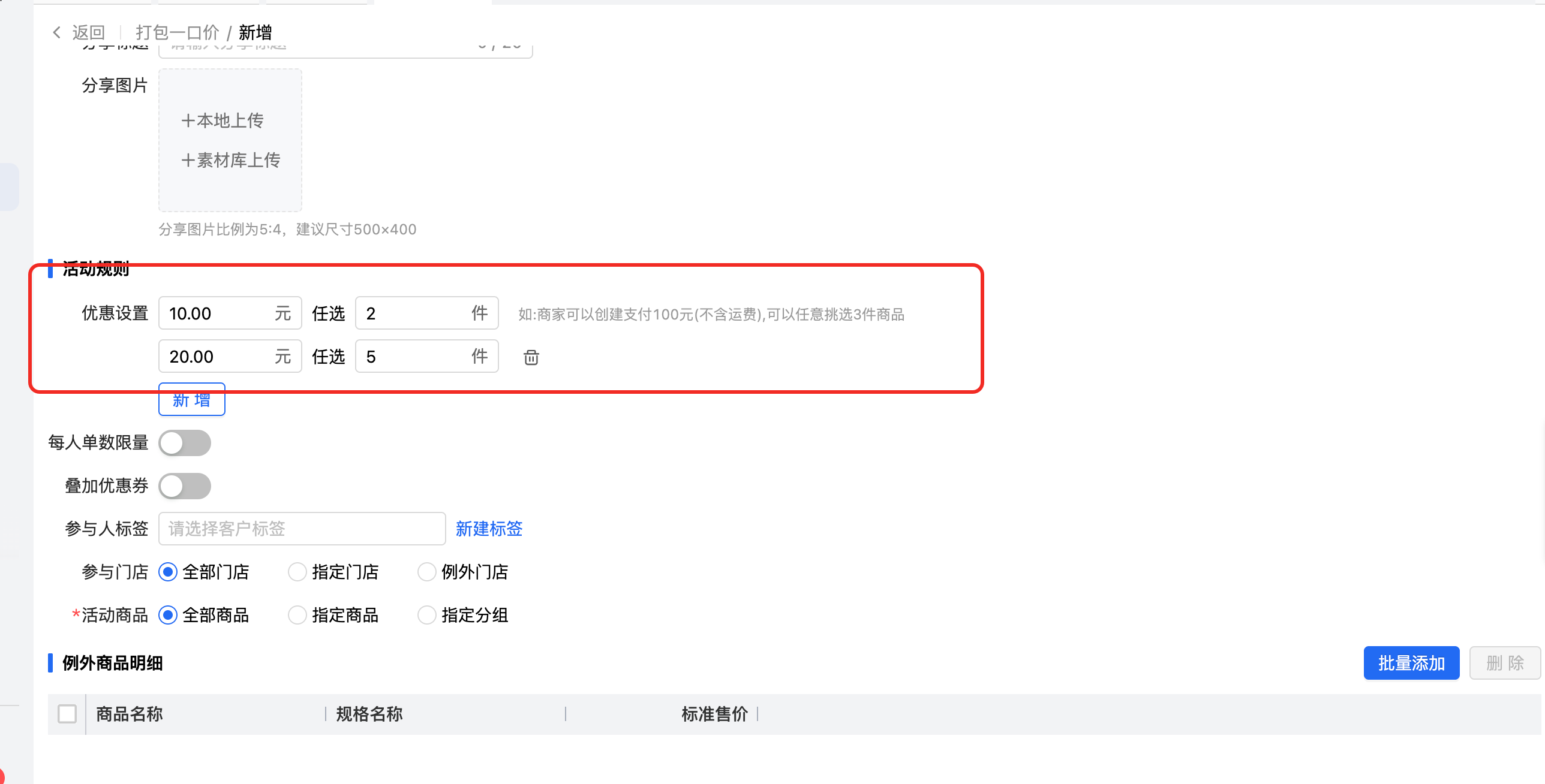 1、活动设置:活动设置增加多级价格,最多3级,下一级的打包价和打包件数都要大于上一级