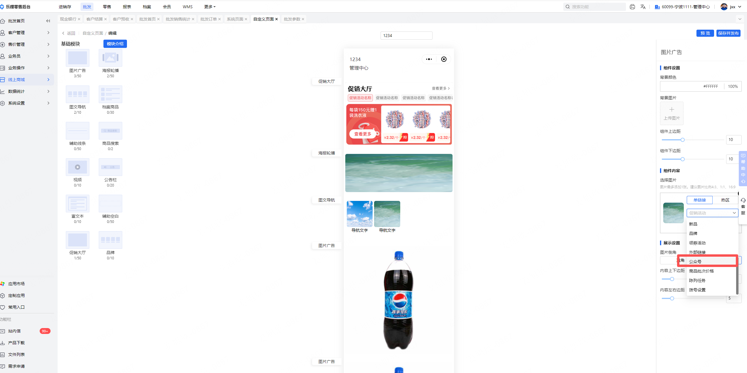 1、自定义页面-图片广告、海报轮播、图文导航的单链接和热区跳转的类型新增一个枚举值:公众号;点击弹出公众号链接填写弹窗,需填写正确的微信公众号链接