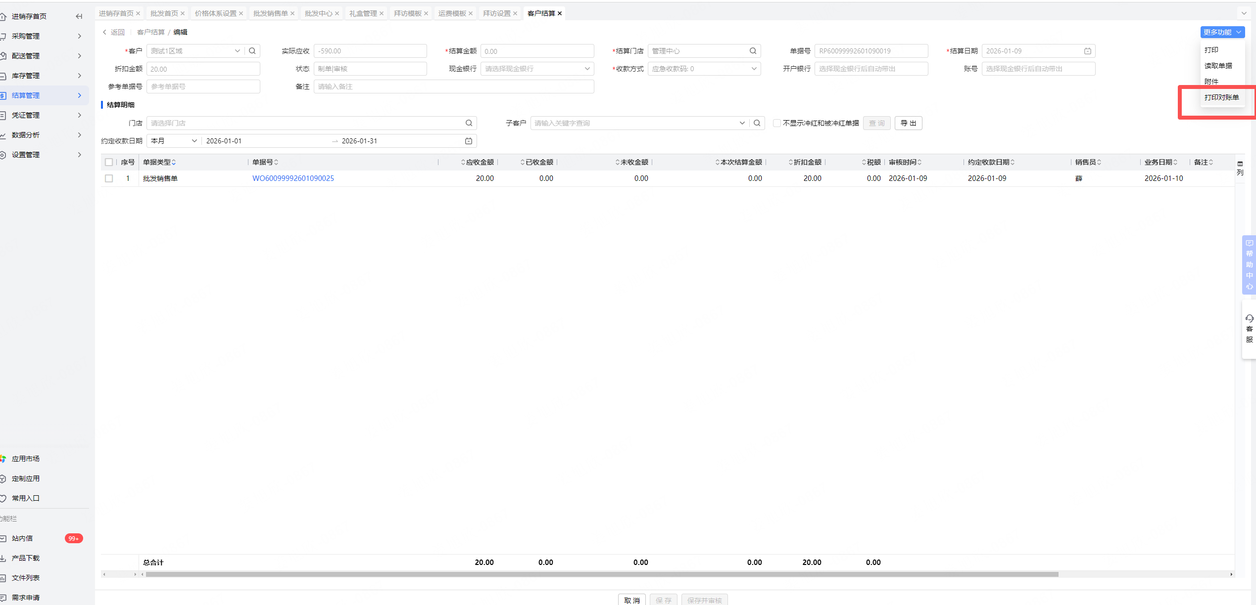 客户其实需要的是一张对账明细表 可以显示本次结算的批发销售单和批发退货单的明细商品 在一张单据上体现 给到批发商那边也直观 仅一张单据就够 可参考目前门店对账单打印