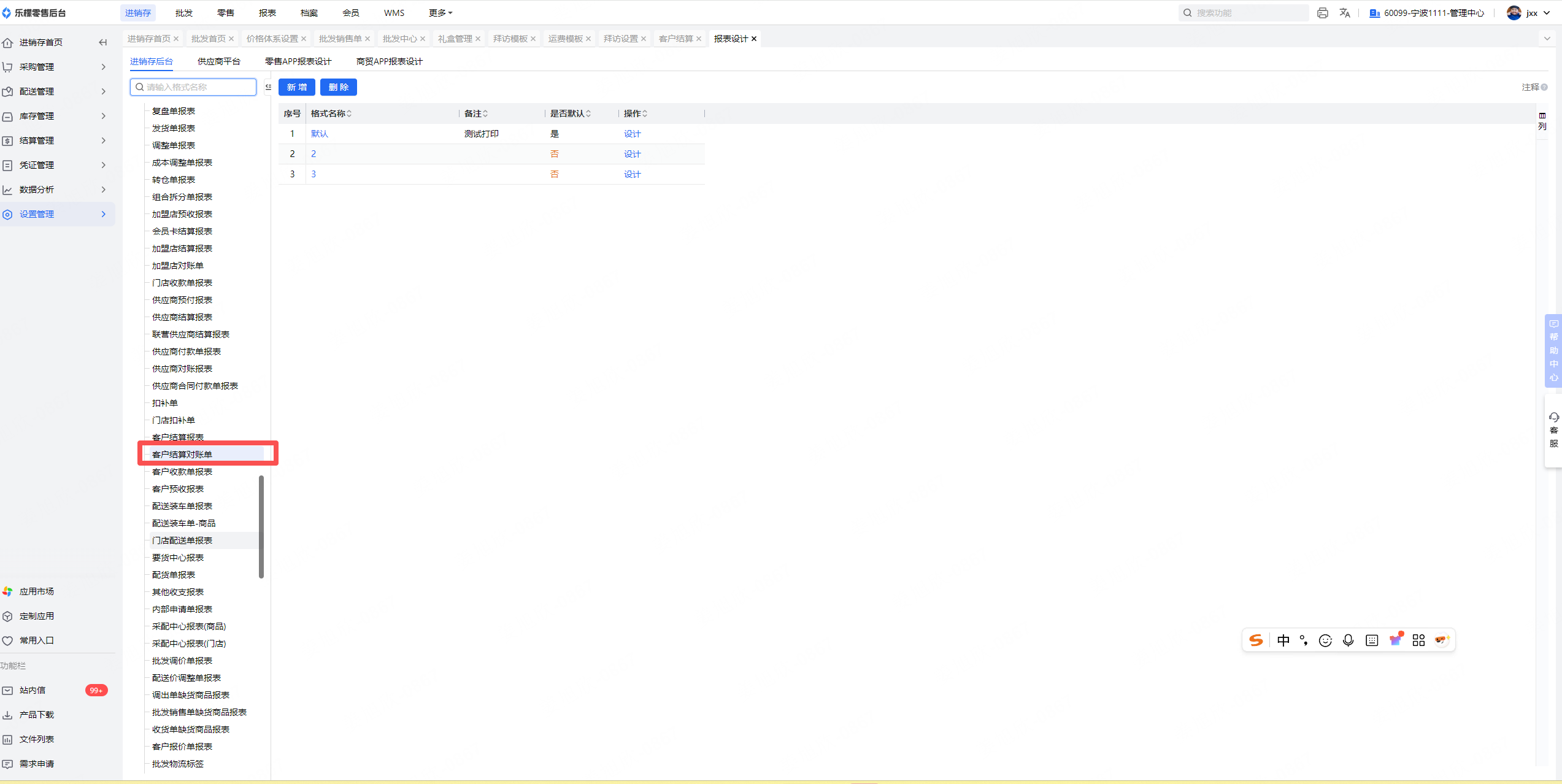 功能路径:进销存-结算管理-客户结算;进销存-设置管理-报表设计
