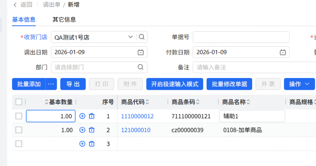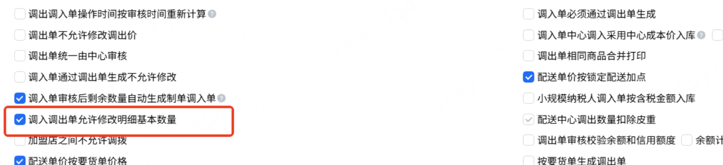 开启参数“辅助单位单位代替常用单位”且商品选择了辅助单位得商品,不判断参数“调入调出单允许修改明细基本数量”是否开启,都允许修改基本数量
