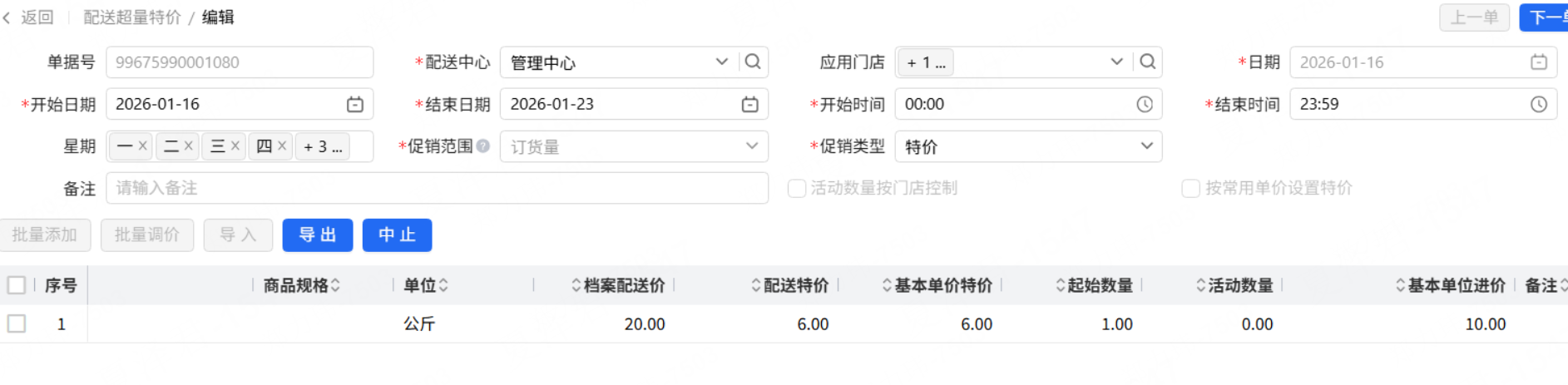 当参数“配送超量特价应用顺序=优先最低价格”,调出单审核时,判断配送超量特价=配送量、临期商品时。按生效中的配送超量特价价格最低的应用。