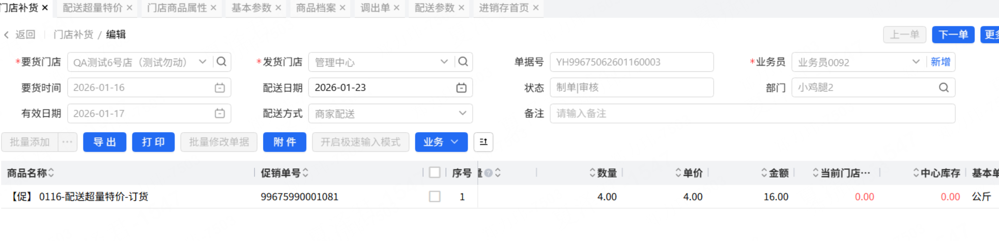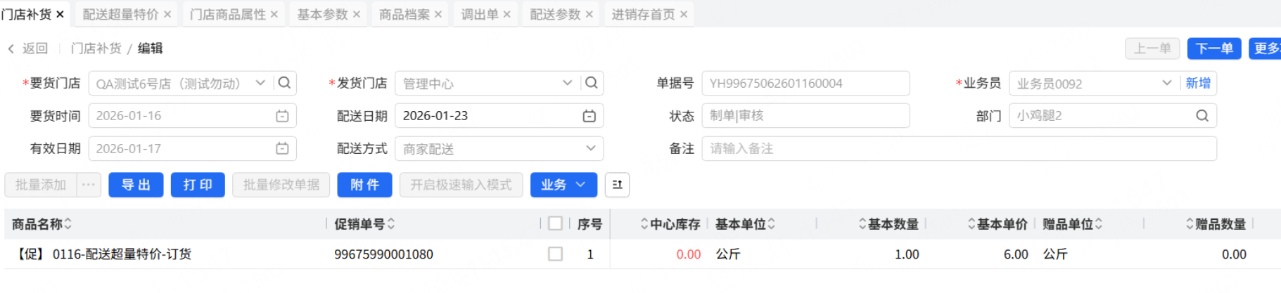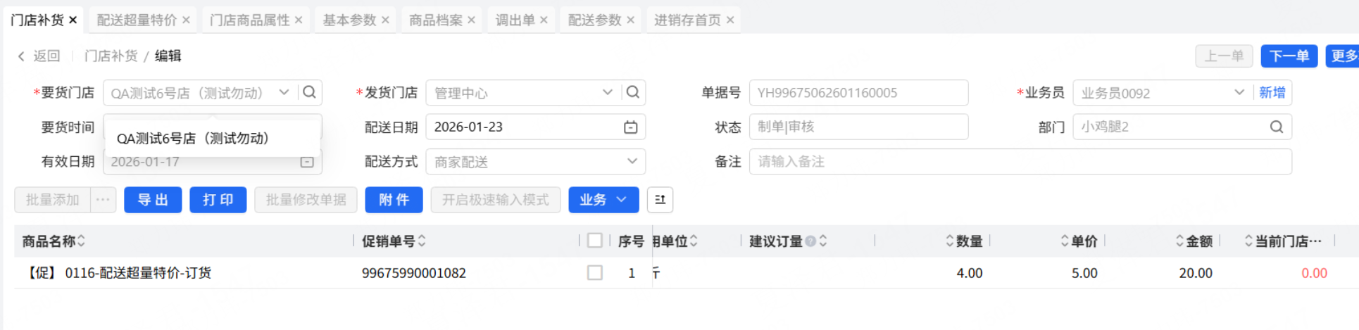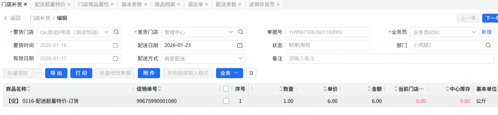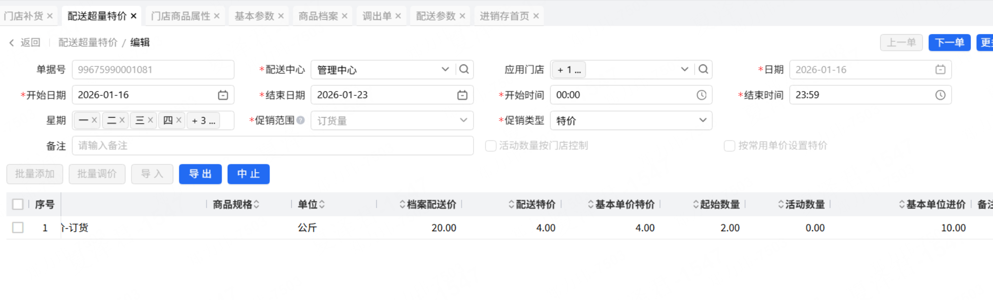 若是预定活动中设置了“配送促销类型”,生成要货单后,需要去预定活动中设置的特价、折扣
