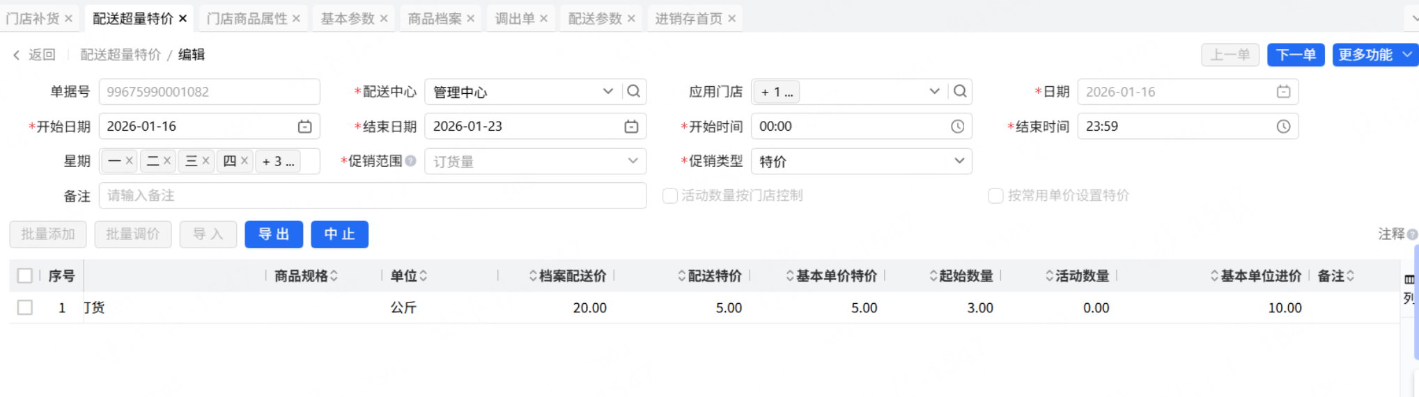 当参数“配送超量特价应用顺序=优先最低价格”。门店补货审核时,判断配送超量特价=订货量时。按生效中的配送超量特价价格最低的应用。