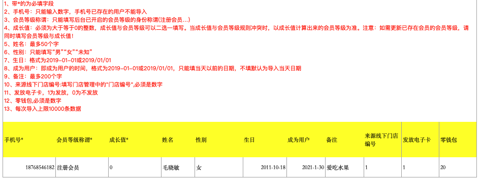 1、导入文件新增列:发放电子卡,1为发放,0或不填为不发放;录入为1时,成功导入会员后给该会员发放一张电子卡