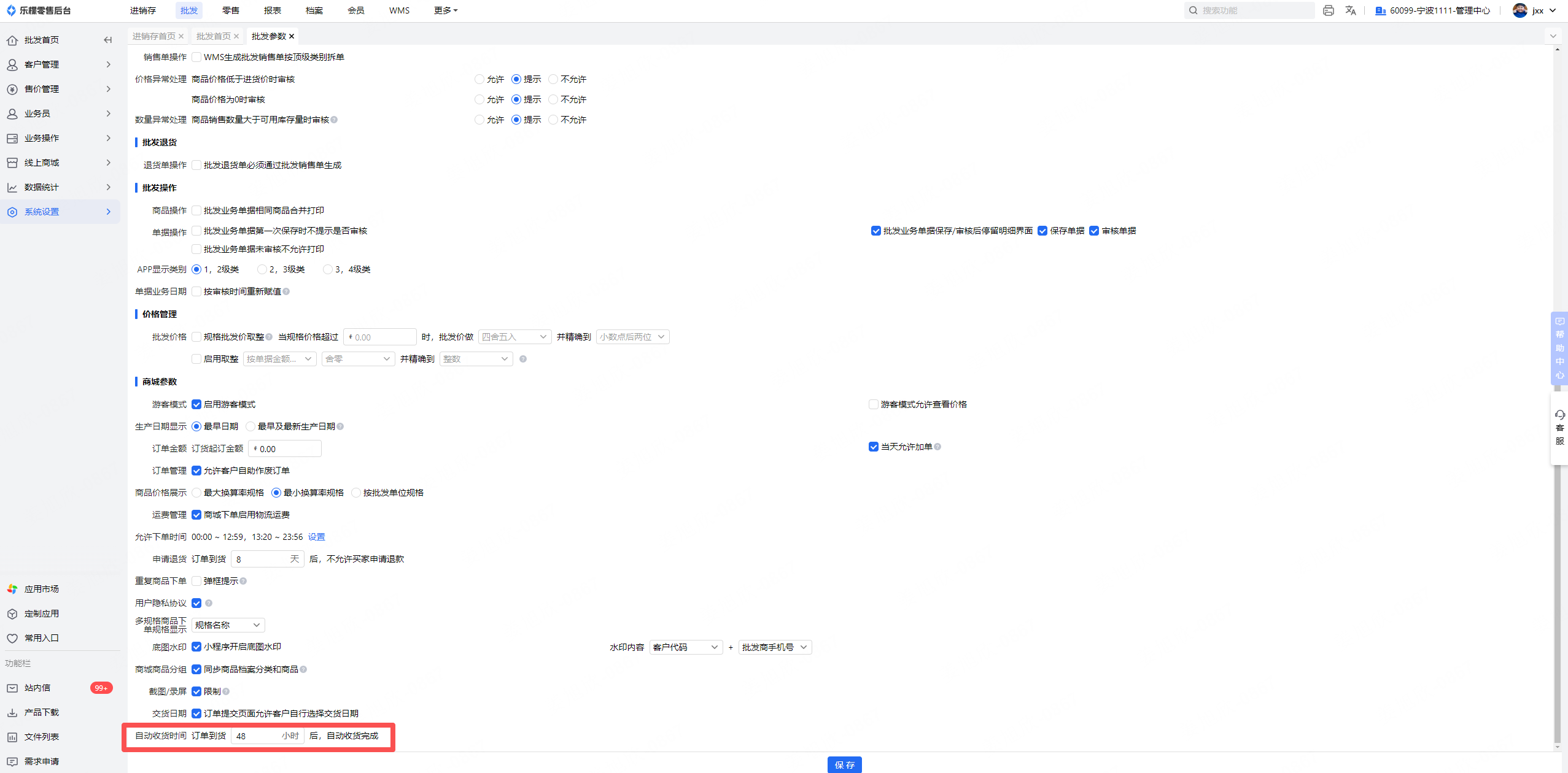 1、批发参数-商城参数新增一个参数“自动收货时间”,可以设置小程序自动收货的时长