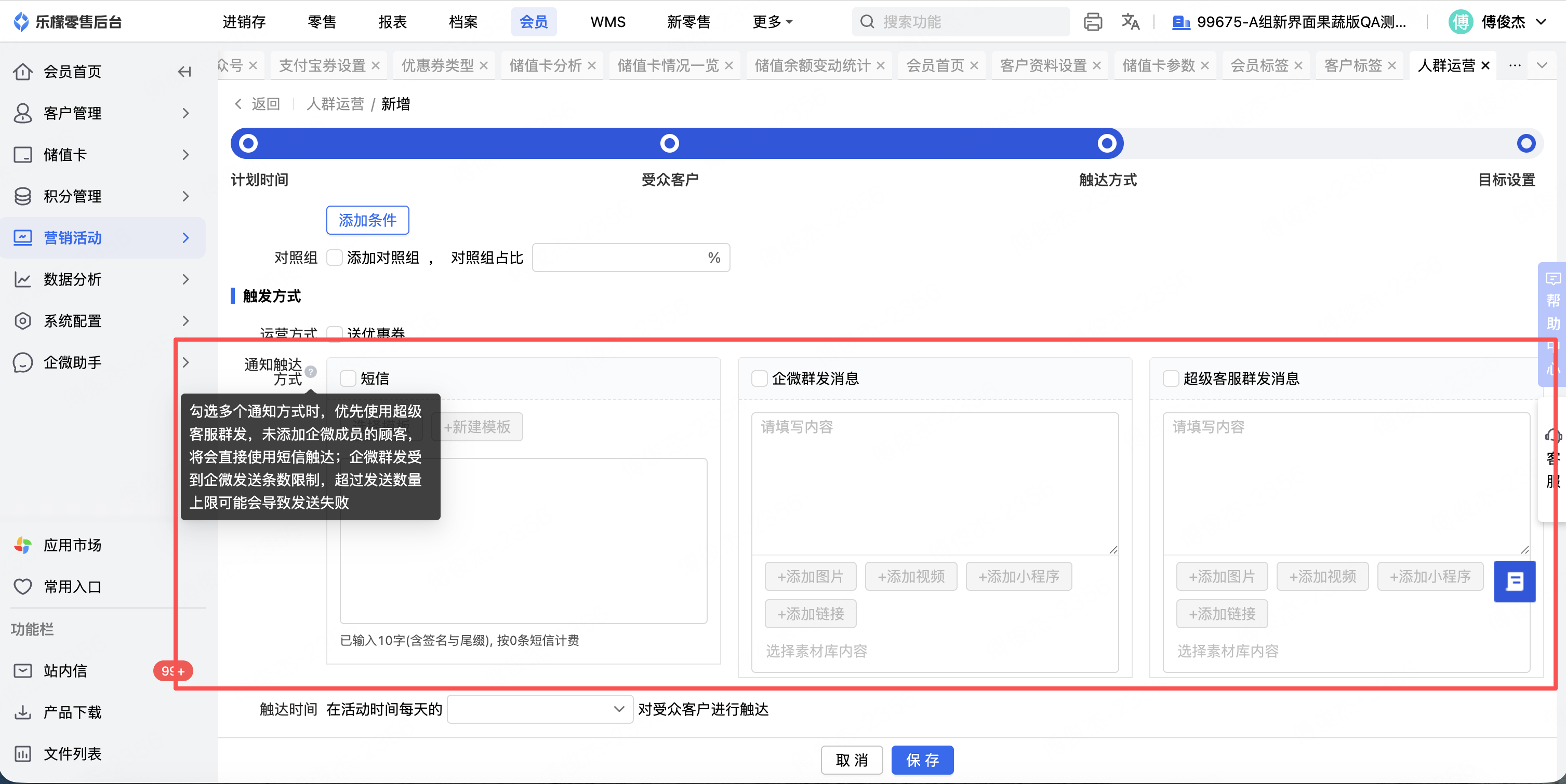 全渠道会员-人群运营-通知触达方式,新增「企微群发消息」和「超级客服群发消息」: