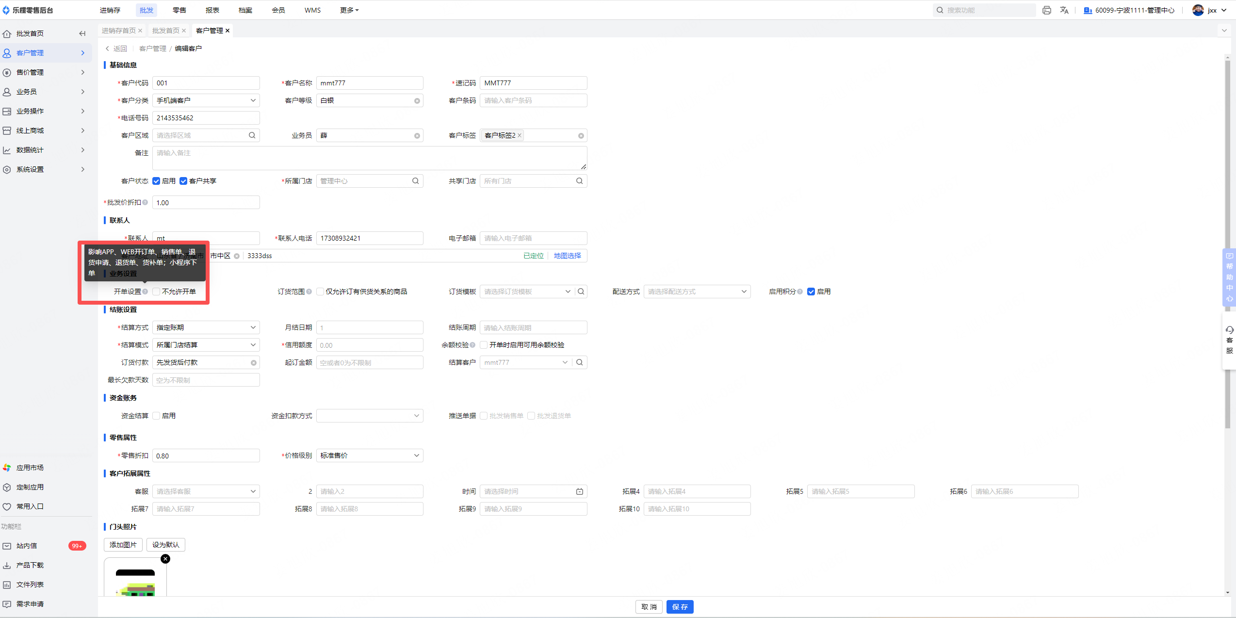 1、客户管理-业务设置:新增一个选项“开单设置”,默认不勾选,即允许开单;勾选则代表订单、销售单、退货申请、退货单、货补单开单时过滤该客户,无法选择(app、web);但是列表客户数据还是可以查询的(每个客户单独设置,主子客户互不影响)