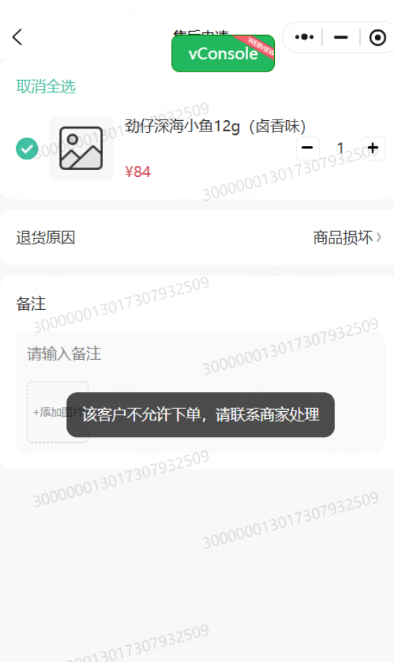 1、勾选“不允许开单”后,购物车页面提交订单时提示“该客户不允许下单,请联系商家处理”