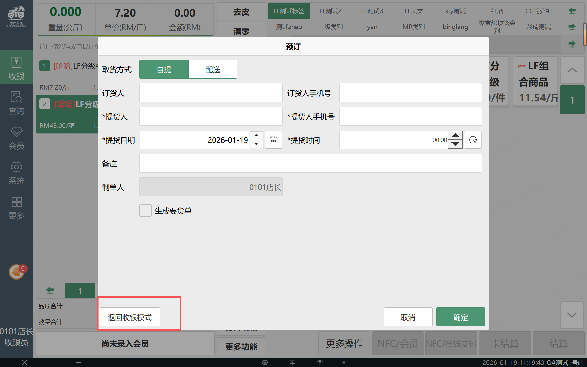2、录入商品,点击预订,弹出预订弹窗,输入预订信息,点击“返回收银模式”按钮,商品保留不清空,本地预订单被删除,点击结算,库存扣减正
