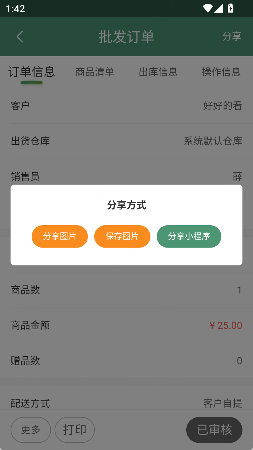 1、批发订单、销售单、退货单通过图片分享不能占用单据的打印次数
